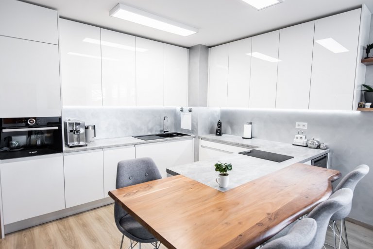 Pre niekoho sterilné nemocničné prostredie – pre nás a majiteľa tejto krásnej kuchyne je to stelesnenie čistoty a minimalizmu. Na rozbitie tohto dizajnu sme použili masívny jedálenský stôl z ponuky nášho ESHOPU. Profesionálni montážnici sa zasa postarali o dokonalú montáž každého detail.