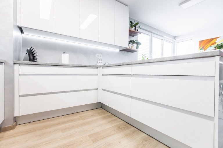 Spodné dvierka na kuchyni: Biely akrylát v dokonalom vysokom lesku