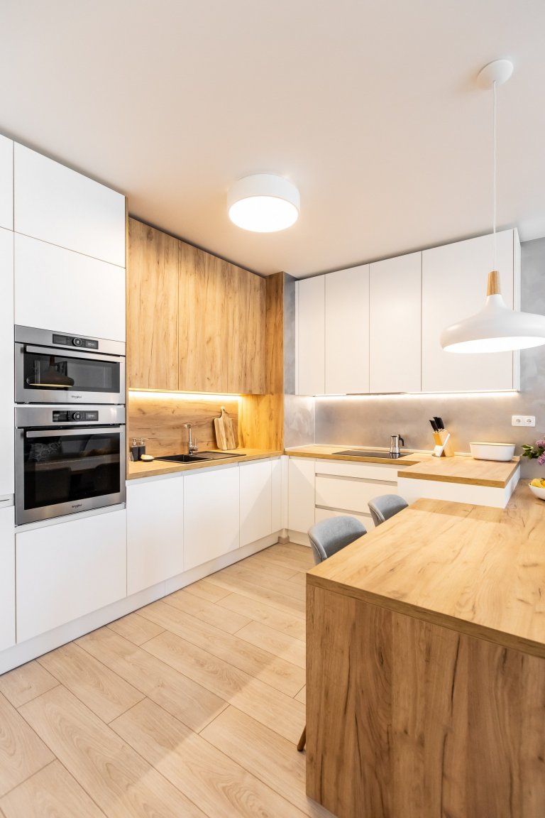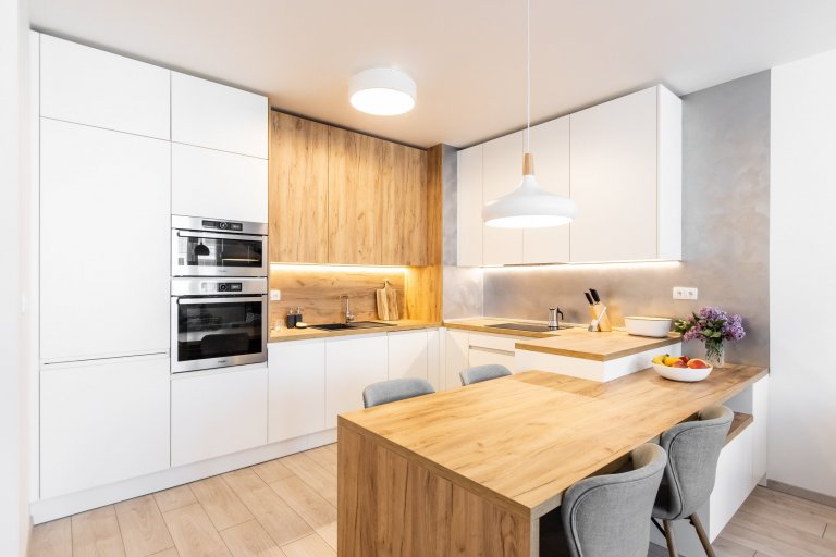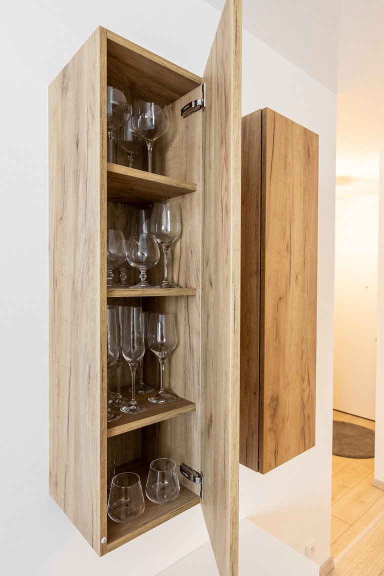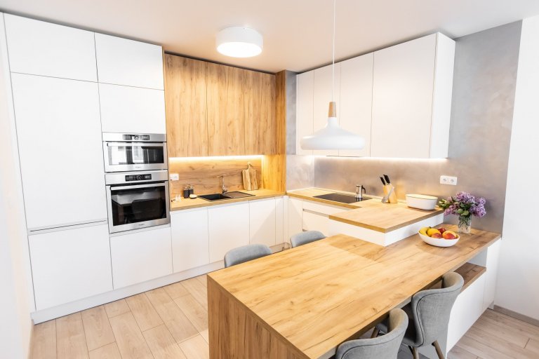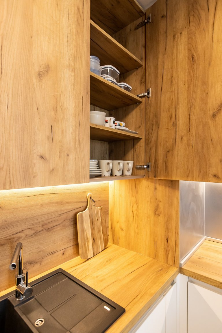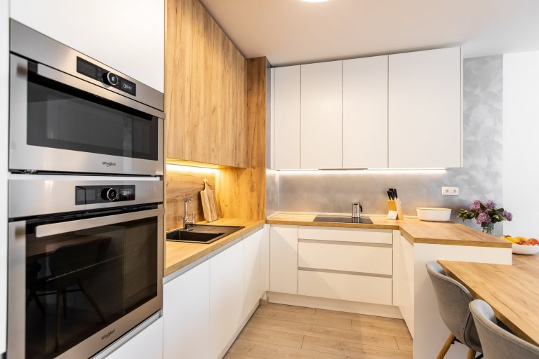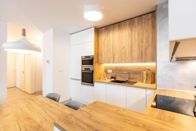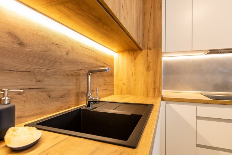 Oku lahodiaca nestarnúca klasika - biely perleťový mat v spojení s dekórom dub zlatý - obohatená o zaujímavé riešenie časti zásteny, kde bol použitý benátsky štuk. Táto umývateľná omietka, ktorá môže mať akékoľvek farebné prevedenie, perfektne dotvára celkový dojem útulného domova.