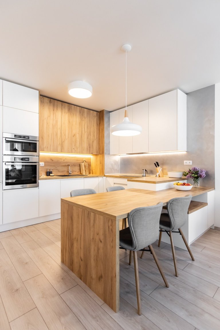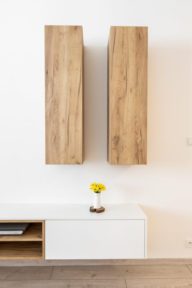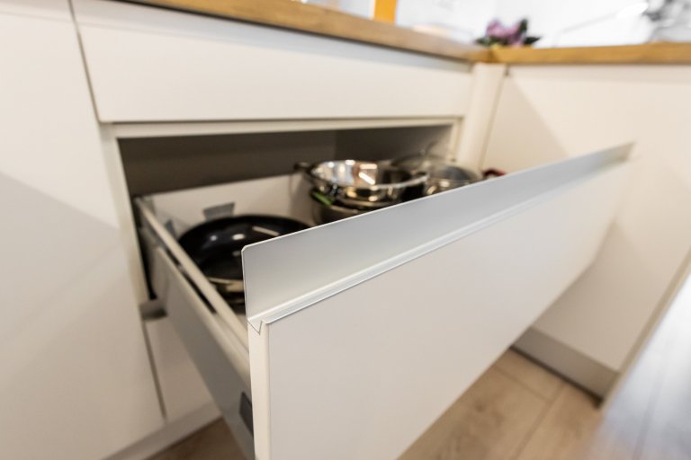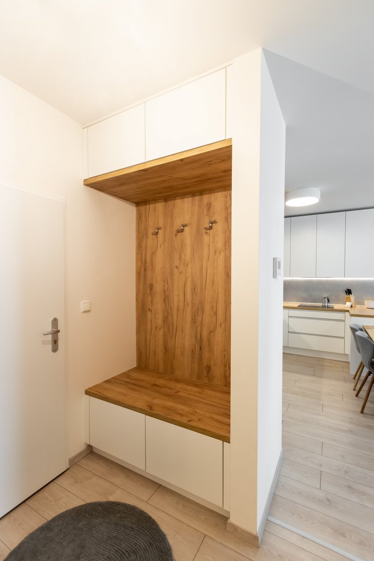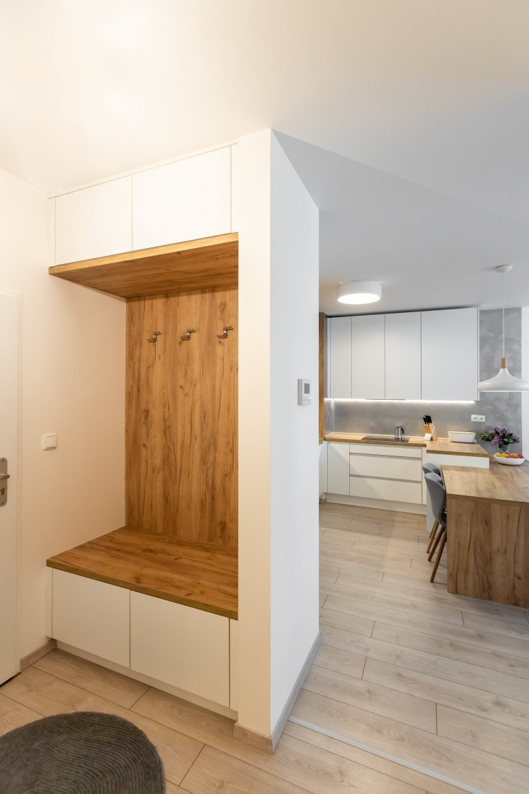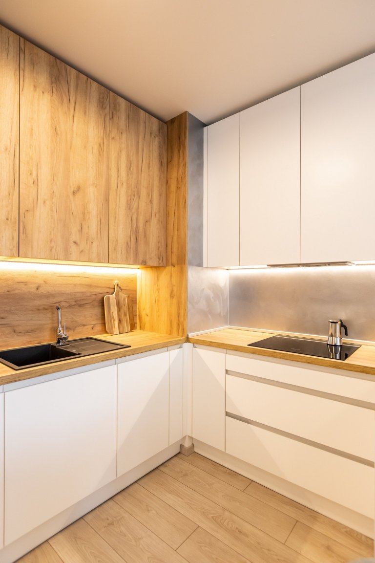 Oku lahodiaca nestarnúca klasika - biely perleťový mat v spojení s dekórom dub zlatý - obohatená o zaujímavé riešenie časti zásteny, kde bol použitý benátsky štuk. Táto umývateľná omietka, ktorá môže mať akékoľvek farebné prevedenie, perfektne dotvára celkový dojem útulného domova.