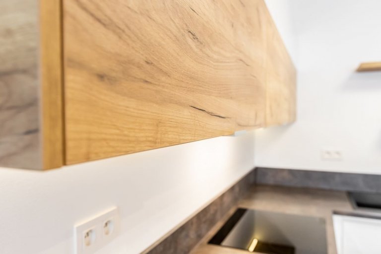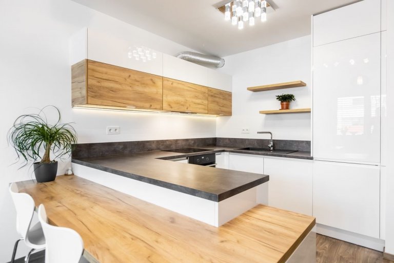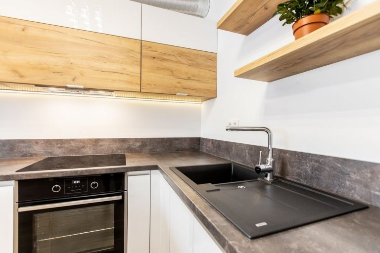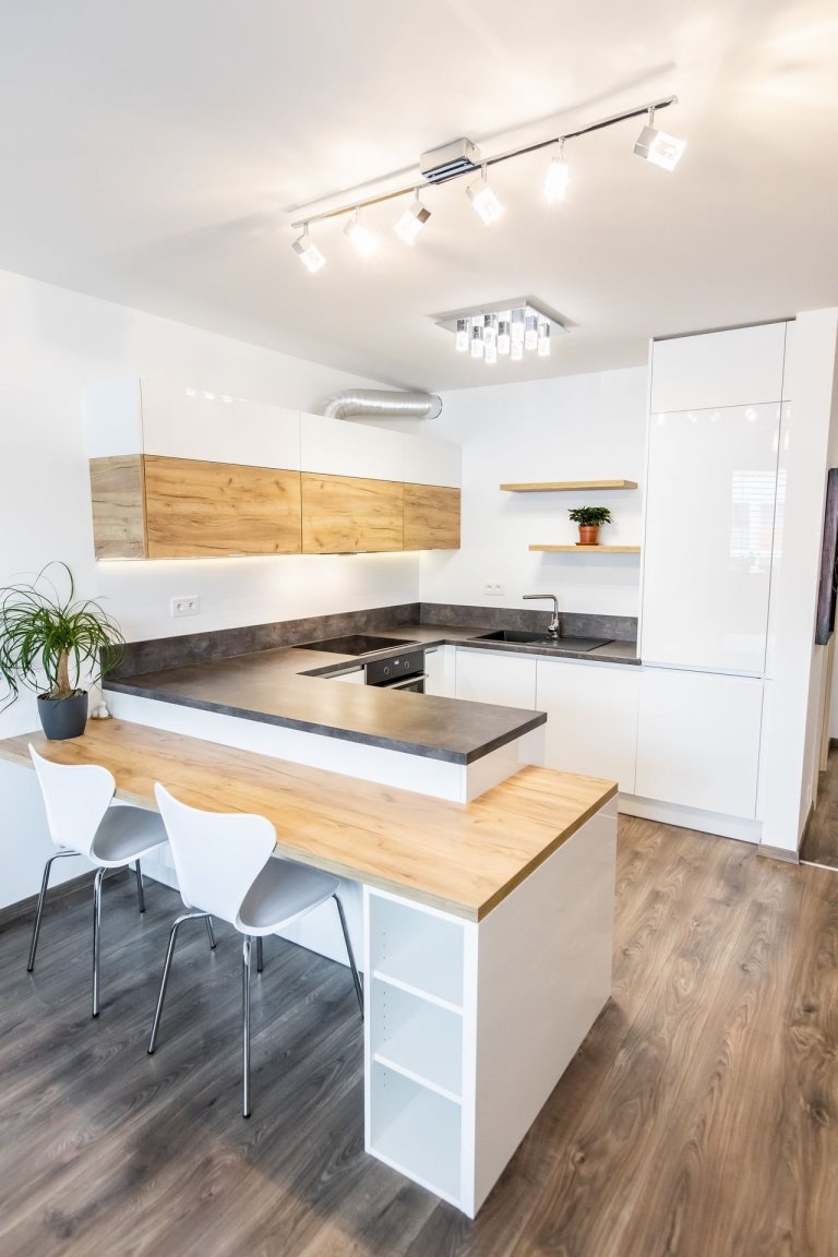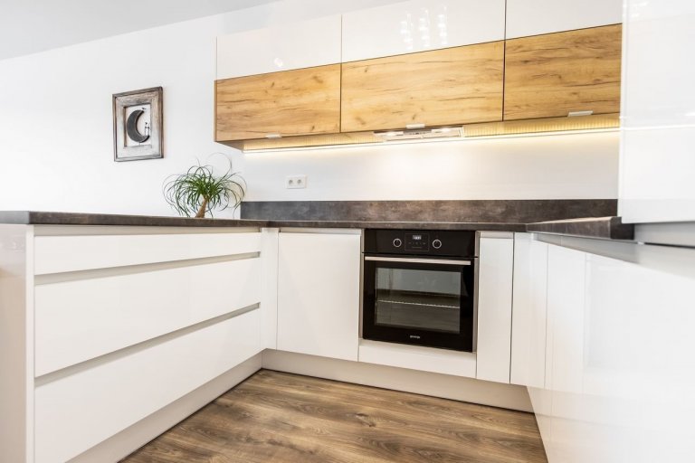 Horné skrinky: Dub zlatý v kombinácii s bielym vysokým leskom