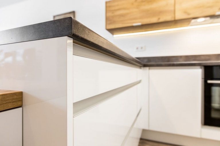 Dolné skrinky a potravinová skrinka: Akryl vo vysokom lesku v bielej farbe