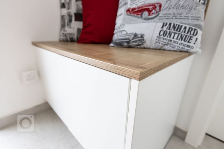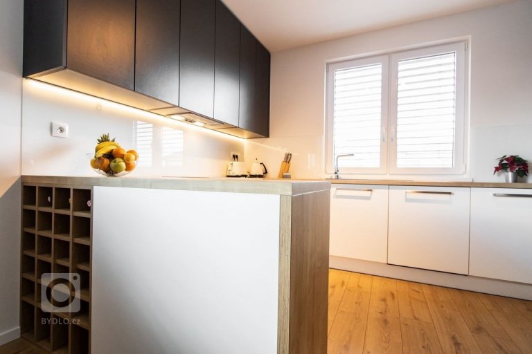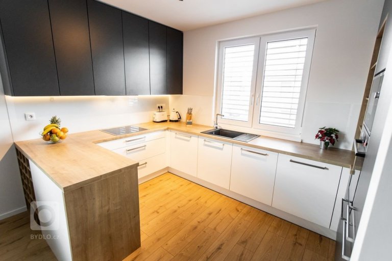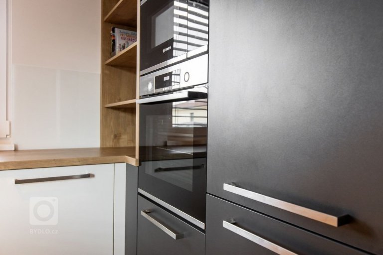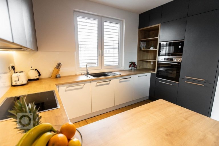 Kuchyňa a nábytok na mieru do celého interiéru - vstavané skrine do izieb, predsieňová skrinka aj skrinka pod TV. Ako býva zvykom, zachovali sme rovnaké materiály naprieč celým priestorom aby, všetko krásne ladili. Pre presnosť, horné a vysoké skrinky sú antracitovom mate, dolné skrinky, TV skrinka a vstavané skrine v bielom perleťovom mate a pracovná doska je z drevodekoru dub zlatý.