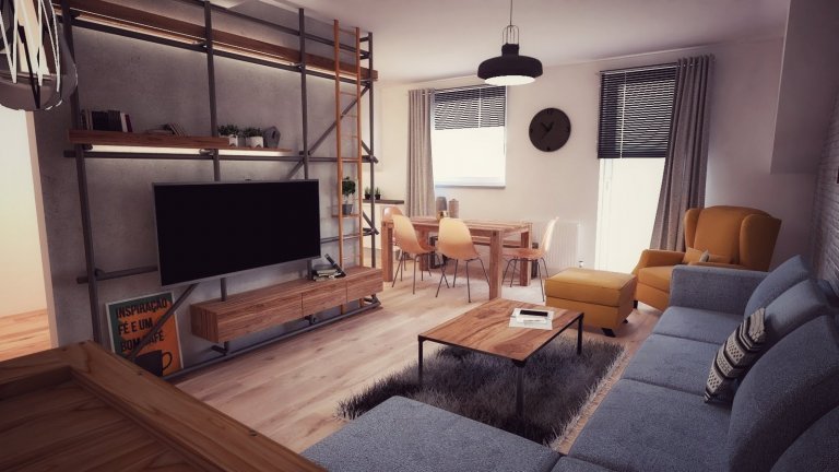 Mladý manželský pár chcel poradiť s riešením bytu. Majú radi industriálny štýl, no zároveň chceli niečo nápadité, niečo čo ľudí prekvapí. Veľa prvkov mali už v interiéri zakúpených, ktoré sa meniť nemohli... pohovka, kreslo, betónová tapeta, stôl a stoličky. Stavebné lešenie sme povýšili na dominantu celého interiiéru. Doplnili sme ho o rebrík a nahrubo opracované dosky, ktoré slúžia ako police. Z jednoduchých prepravných debien v kombinácii s lanami a kladkami sme získali kreatívny úložný priestor. Radi navrhujeme interiéry trochu INAK, dúfame, že sa nám to podarilo aj tentokrát.