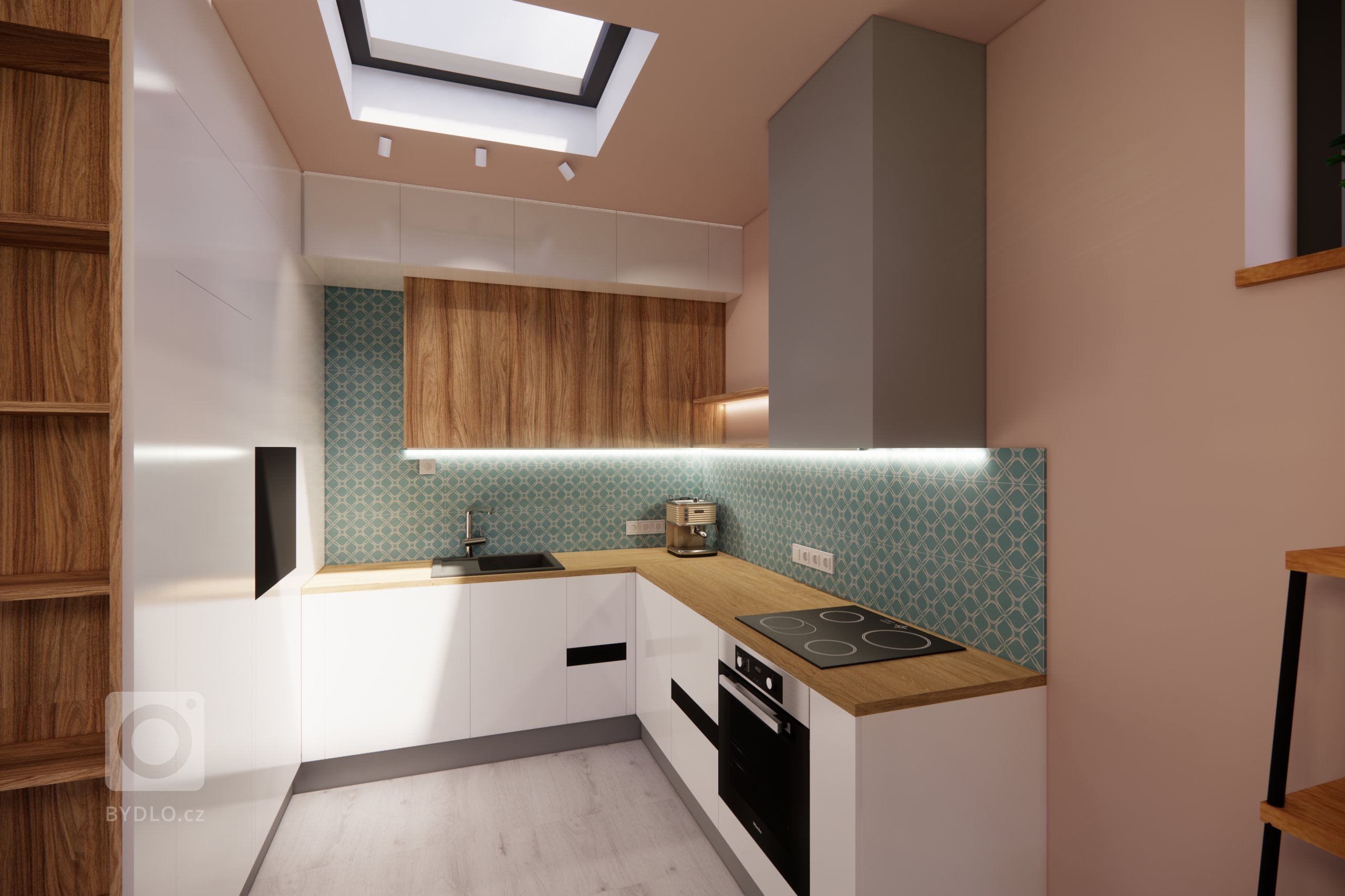 Kuchyně již byla ve výrobě, navrhli jsme dřevěnou pracovní desku a obklad za ní