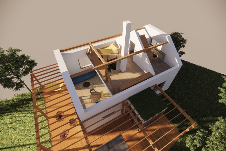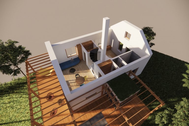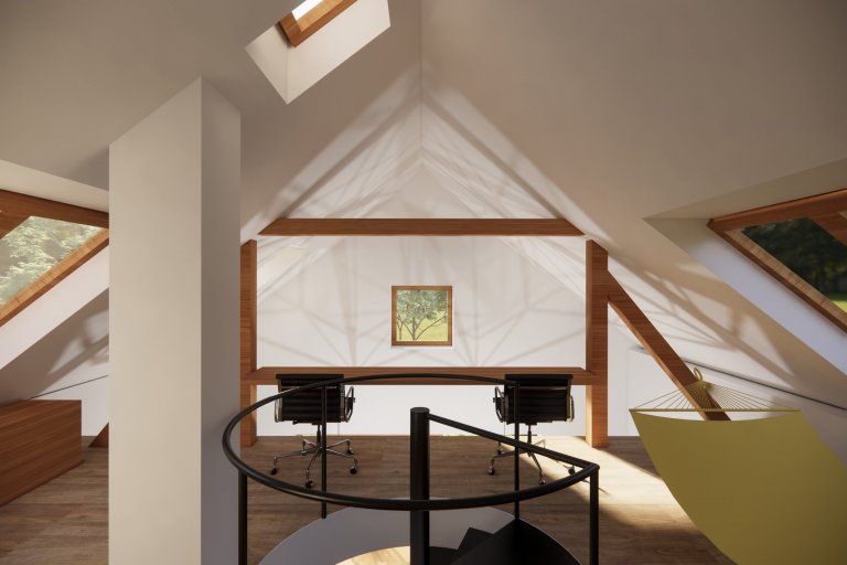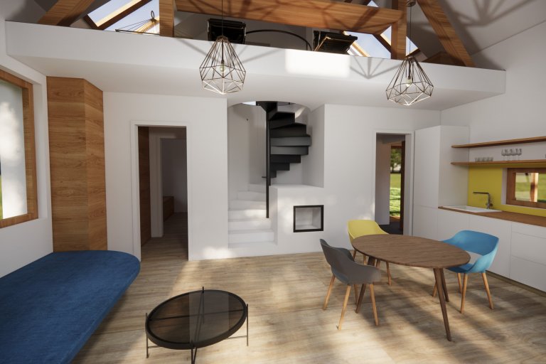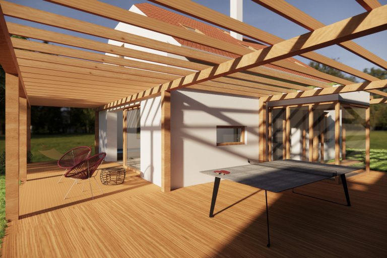 Hlavním motivem návrhu je propojení obytného prostoru se zahradou - navrhli jsme velkorysé posuvné okno, otočili vniřní dispozici domu a vytvořili terasu zakrytou pergolou. Pohodová atmosféra interiéru je tvořena významnou převahou dřeva a příjemných barevných odstínů. Centrální pozice točitého schodiště pod sebou ukrývá kamna.