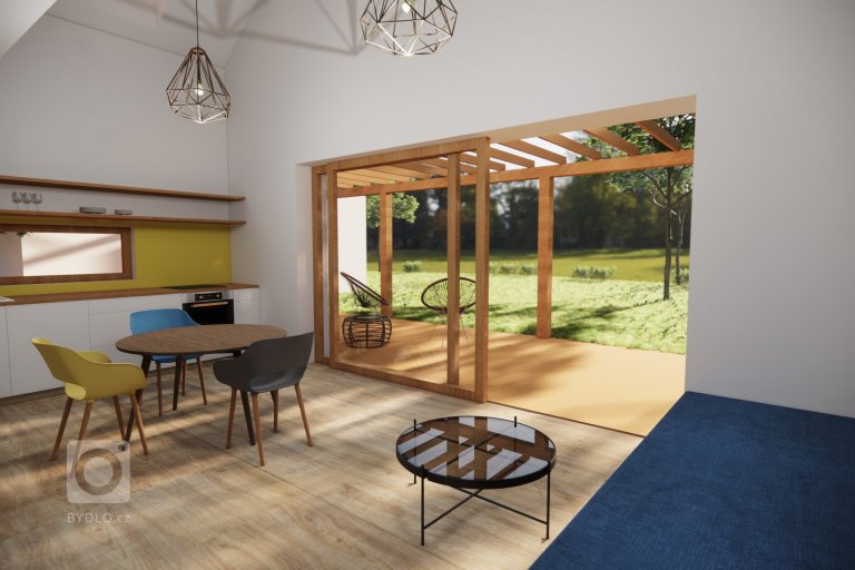 Pohled z obytného prostoru - velké posuvné okno nabízí příjemný pohled do zahrady