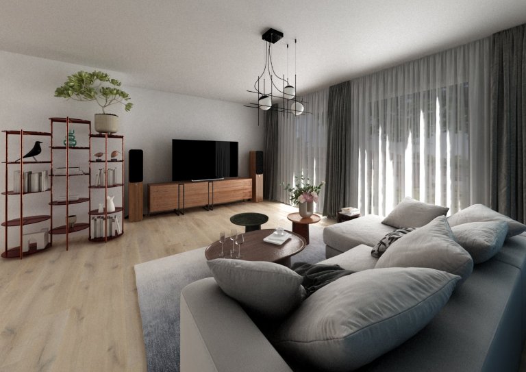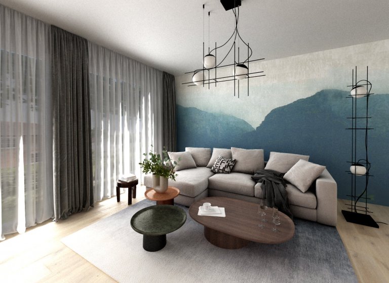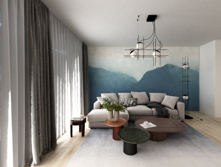Jedná se o rekonstrukci bytu z padesátých let, jehož majitelé jsou příznivci klasičtějšího stylu a přírodních materiálů. Jinak se fantazii v návrhu meze nekladly a měli jsme docela velké pole působnosti. Byt o rozloze 130 m2 má oddělenou kuchyni, jídelnu, obývací pokoj, dvě ložnice a pracovnu. Propojovacím prvkem celého bytu jsou krásné a originální tapety od francouzské firmy Elitis, které udávají celkovou atmosféru a krásně vystihují duši a umělecké naladění majitelů. Všechny místnosti mají nádech domodra, ale každá je trochu odlišná. V jídelně je dominantou centrální dřevěný stůl, který podtrhují shluk designových světel od andlight. Na jídlenu přes otevřenou chodbu navazuje obývací pokoj, kde jsme kombinovali dřevo i kovové prvky na světlech, poličkách i částech nábytku. Vše pak zjemňují závěsy, koberec, polštářky a opět tapeta za sedačkou..... Protože majitelé nechtěli mít v ložnici klasicou šatní skříň a velikost prostoru to dovolovala - místnost jsme předělili na 2 části - hlavní, kde je krásná dřevěná postel - a šatnu, která je umístěná za čelem postele a je oddělená středovou polostěnou, za kterou se zašupují z každé strany posuvné panely a maželé mají každý přistup ke své části. Ložnici opět ozvláštňuje zasněný motiv tapety od elitis a podtrhují světla od Brokis a firmy Vibia.