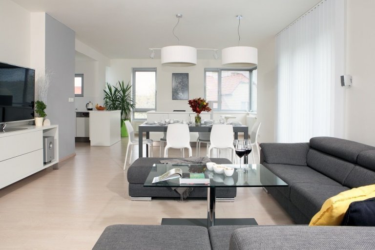 Práce na návrhu bytu v novostavbě La Crone pro nás byla moc hezkou výzvou. Majitelka - úžasná žena- si přála elegantní, jemný, světlý, vzdušný interiér. Nechtěla, aby se v prostoru objevila černá barva, proto jsem volili kombinaci bílé/krémové a dřeva. Obývací pokoj není moc veliký, ale celá jedna stěna je tvořena francouzskými okny a propojuje místnost s velikou terasou a opticky zvětšuje. Protipóĺem je pak v prostoru lakovaná bílá minimalistická kuchyň a naproti velká stěna s posuvným panelem, který zakrývá TV a je v ní spoustu úložného prostoru. Výrazným prvkem je dřevěné žebrování na stropě, které mělo elegantně zakrýt konstrukční nerovnosti. Žebrování pak přechází svisle v polostěnku, která jemně odděluje obývací část od kuchyňské. Dalším výrazným prvkem je ikonické světlo Vertigo od Petite Friture. Ložnice je materiálově koncipovaná obdobně - bílá s dřevěnými elementy. Centrální je manželská postel a za ní navazující stěna. V rohu je pak dále elegantní kosmentický koutek a naproti veliká zapuštěná šatní skříň.
