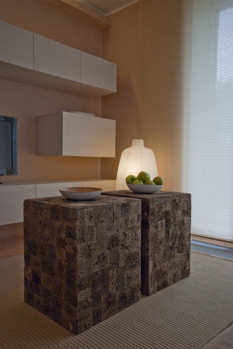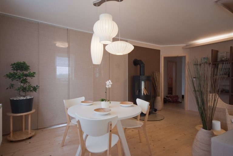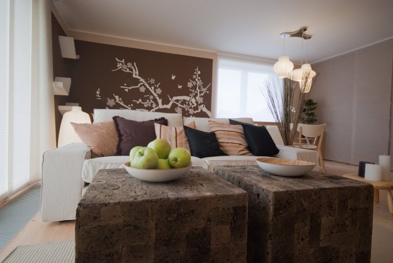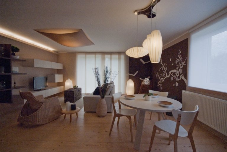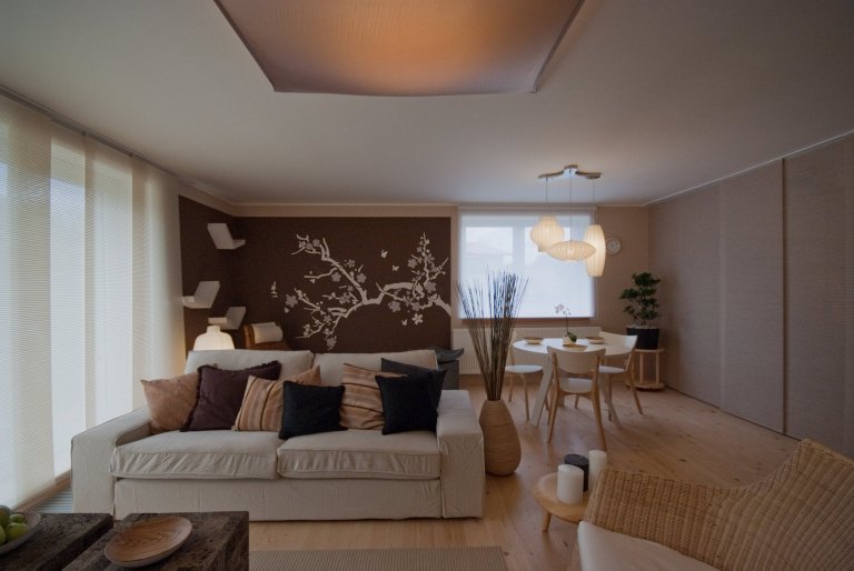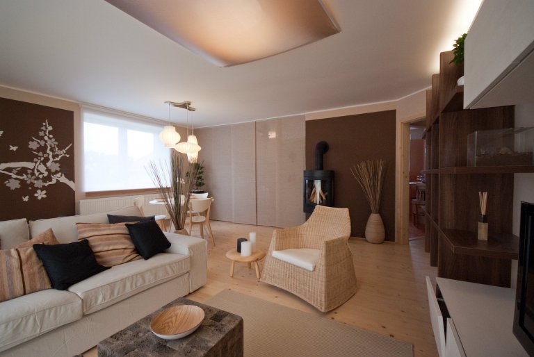 Interiér laděný do zemitých přírodních odstínů s motivy dálného východu.