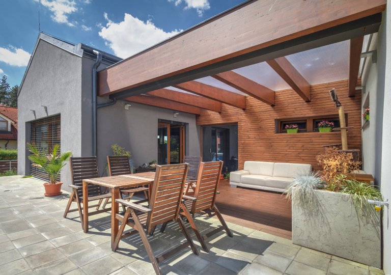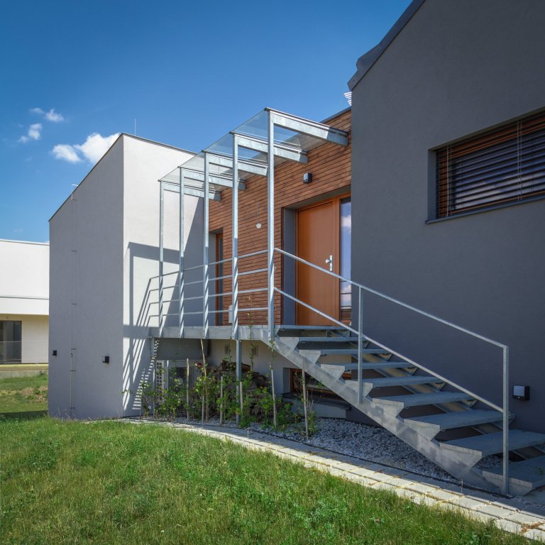 Dům je umístěn v severní části pozemku a otevírá se velkým francouzským oknem a atriem na jih do zahrady. Svou formou - tvarem střech a velikostí hmot - odkazuje k tradiční venkovské zástavbě. Vnitřní uspořádání se propisuje do vnější formy domu – šedá část s obytným prostorem, bílá s ložnicemi, vzájemně propojené dřevěným, komunikačním a obslužným traktem.