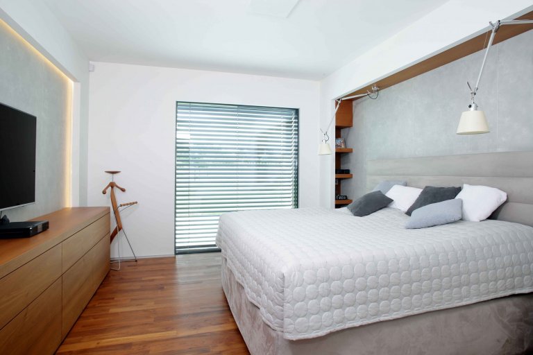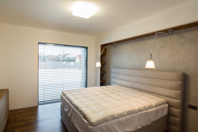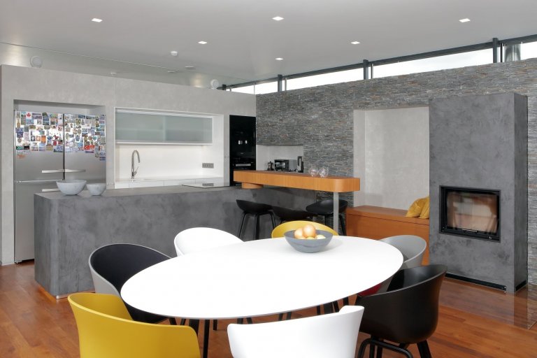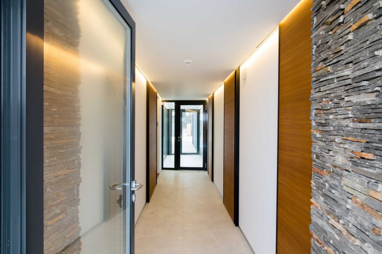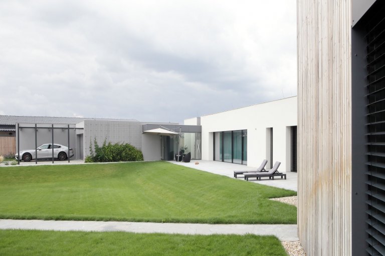 Dům je rozložen do několika jasně čitelných hmot. Otevírá se velkým prosklením na jih do zahrady. Jedná se o moderní architekturu, plně vybavenou současnými technologiemi (tepelné čerpadlo, rekuperace, solární panely). Dům je objemově velice komfortní, jednotlivé hmoty však respektují okolní vvenkovskou zástavbu. Vnitřní uspořádání se propisuje do vnější formy domu – dvougaráž porostlá zelení, bílý hlavní dům s posuvnými okny se subtilními profily, prosklený bazén, drevěný domek s posilovnou a pokoji pro hosty. Matriály jsou navrženy klasické - kámen, dřevo, sklo, beton, ocel. Interiér je harmonicky propojený s exteriérem domu.