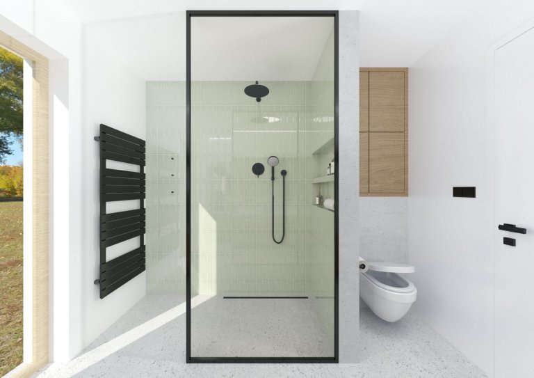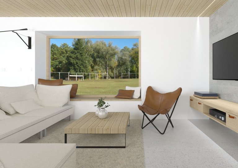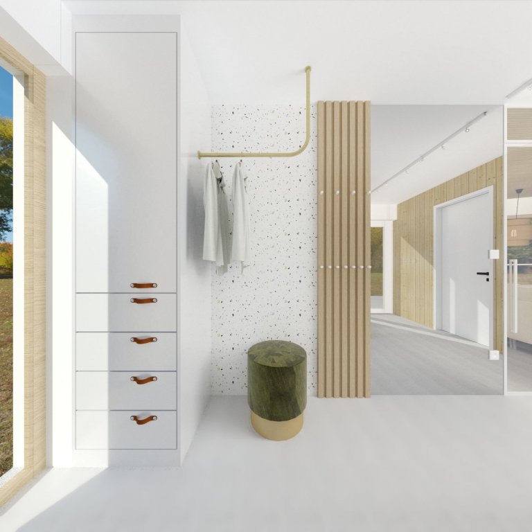 Majitelky se rozhodly postavit svou vysněnou dřevostavbu z křížem lepených masivních panelů. Obě jsou milovnice jednoduchosti a funkčnosti, proto je celý interiér navržen v tomto duchu. Hlavní materiálovou kombinací je masivní smrkové dřevo, které je přiznáno také na některých konstrukcích, a beton, který je na podlaze v přízemí. V interiéru jsou použity některé speciální kousky nábytku, jako například konferenční stolek vyrobený z odřezků stavebních panelů nebo jídelní stůl a hodiny ze dřeva letitého ořešáku, který dříve stával na pozemku a majitelky si přály jej do interiéru zakomponovat. Celkové řešení interiéru je zejména praktické a pohodlné pro ženy, tedy i snadné na údržbu.