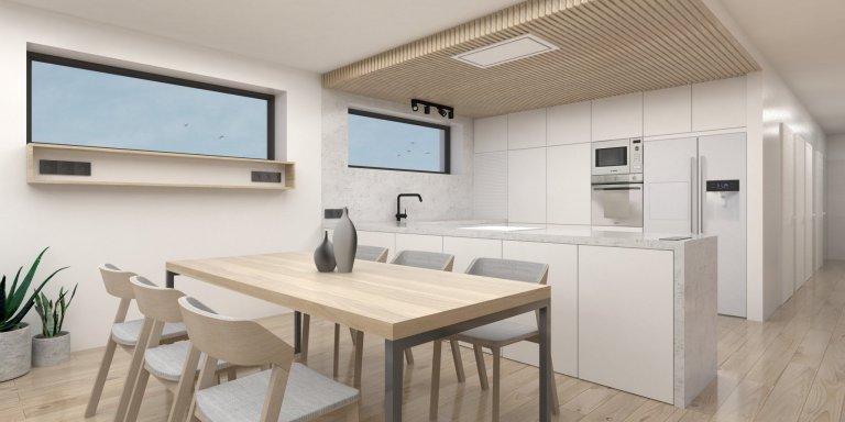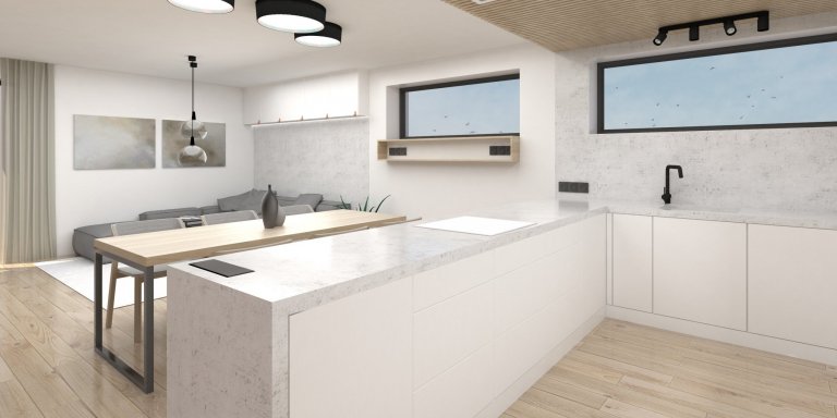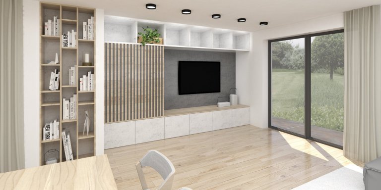 Nedaleko Českých Budějovic právě roste nový rodinný dům pro mladý pár, který nezapře svůj vytříbený vkus. Majitelé nás oslovili na začátku výstavby, což je ideální stav. Pro hlavní obytný prostor jsme společně zvolili jednoduchou barevnou paletu kombinující dekor betonu, světlého dřeva, bílé a přírodních tónů, na nichž byl interiér vystavěn. Neutrální paleta působí příjemně a poskytuje prostor pro vlastní dekorace. Kromě kuchyně s jídelním koutem a obývacím pokojem byla navržena také ložnice, kde padla volba na tmavší přírodní tóny. Béžová, hnědá, ořechové dřevo a detaily v černé vytvořily elegantní základ, který oživují industriální prvky. V návrhu jsou s ohledem na rozpočet mladých majitelů kombinovány prvky vyráběné na míru s výrobky z běžných řetězců.
