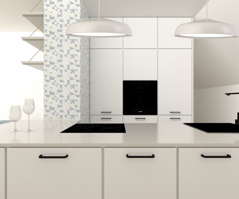 V malém pražském bytě bylo nutné zařídit zcela novou kuchyni na kterou ale zbývalo jen velmi málo místa, majitelé si však přáli do kuchyně umístit také pračku se sušičkou a vinotéku. Půdorys je navíc nešťastně rozdělen instalační šachtou. Celé řešení tedy muselo být zejména praktické. Rozhodli jsme se pro ostrůvkovou kuchyni ve světlých šedobéžových barvách v kombinaci se světle modrým geometrickým obkladem. Jednoduchou barevnost jsme doplnili černými spotřebiči a detaily v podobě kuchyňské baterie a úchytek. Skromné úložné prostory jsme rozšířili pomocí skříněk které jsme umístili do chodby. Návrh vznikl ve spolupráci s Truhlářstvím Ochozka.