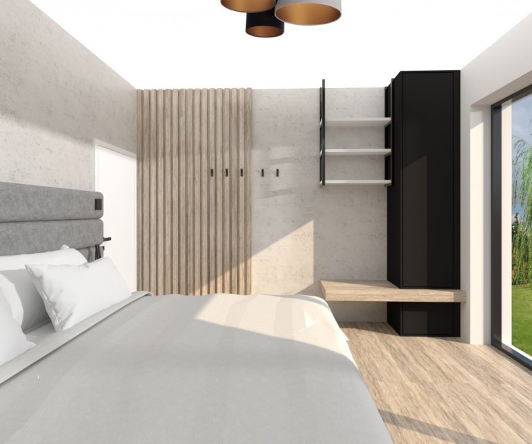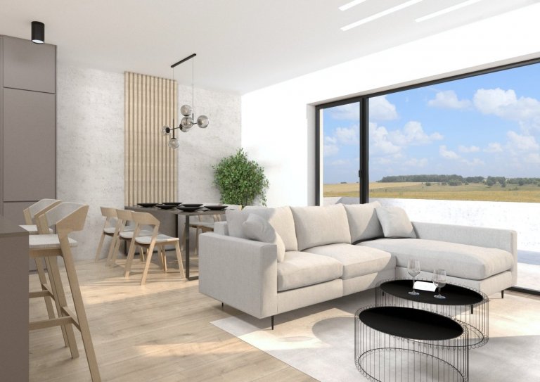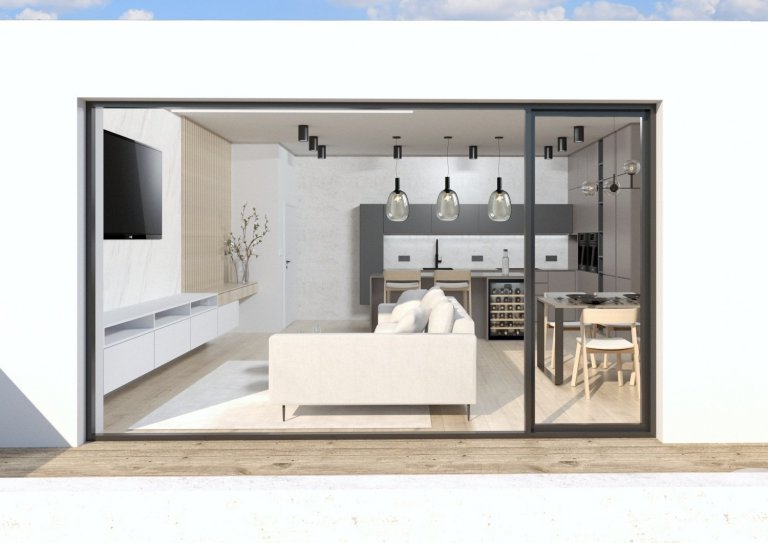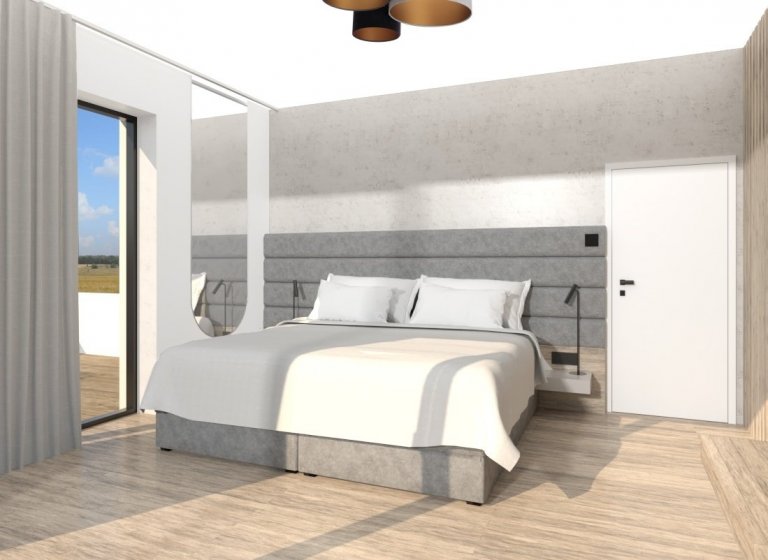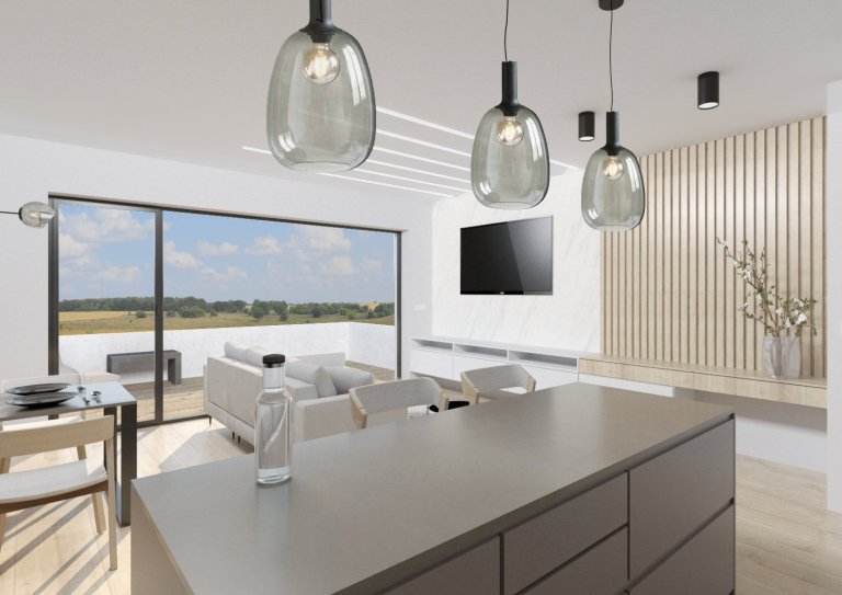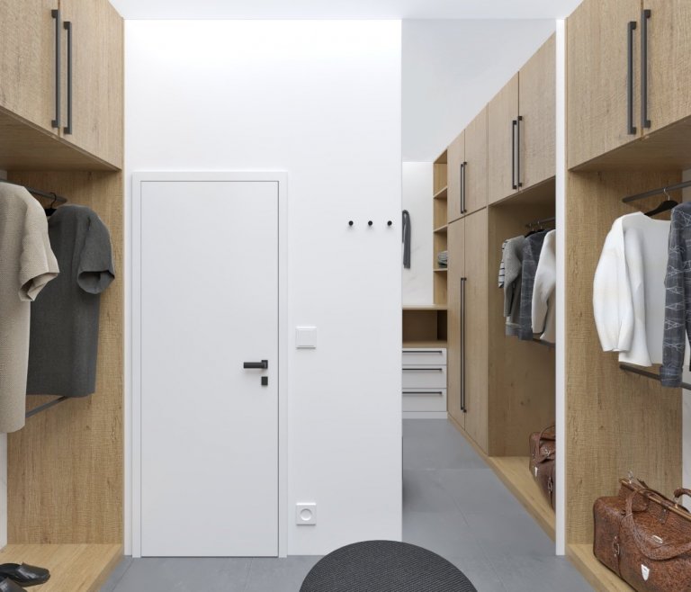 S majiteli bytu v právě vznikajícím bytovém komplexu v Táboře jsme se setkali ve chvíli, kdy už měli částečně naplánovanou kuchyni od kuchyňského studia, ale nebyli příliš spokojeni. Rozhodli se mě proto oslovit s prosbou o konzultaci, jak mají kuchyni ještě vylepšit, než půjde do výroby. Z konzultace se ale vyvinula spolupráce na návrhu téměř celého bytu. Design prostorného dvoupatrového bytu, který vznikl spojením dvou menších bytů nad sebou, vychází z již vybraných materiálů kuchyně a dekoru podlahové krytiny v bytovém standardu. Podle vkusu majitelů jsem se rozhodla vsadit na elegantní minimalismus, použili jsme různé odstíny šedé od světlých až po antracitovou. Výrazným sjednocujícím prvkem interiéru jsou vertikální latě z masivního dřeva a stěrka v trochu netradičním šedobéžovém odstínu.