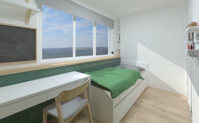 Školák a malý sportovní nadšenec se po přestěhování do panelového domu konečně dočkal samostatného pokoje. Při návrhu jsme se museli vyrovnat s extrémně malou plochou, a přitom pokoj vybavit vším, co chlapec potřebuje. Jednoduchý a funkční půdorys maximálně využívá prostor, a dokonce umožňuje do pokoje umístit přistýlku pro návštěvy, což byl jeden z požadavků. Původní nevzhledné topení a rozvody zakrývá zelený perforovaný plech s odkládací plochou. Protější stěnu dekoruje travní koberec. S ohledem na omezený rozpočet majitelů je pokoj vybaven vestavnou skříní vyrobenou na míru, kterou doplňuje kupovaný nábytek.