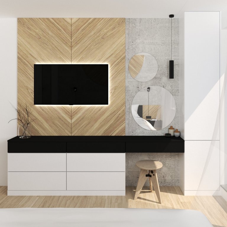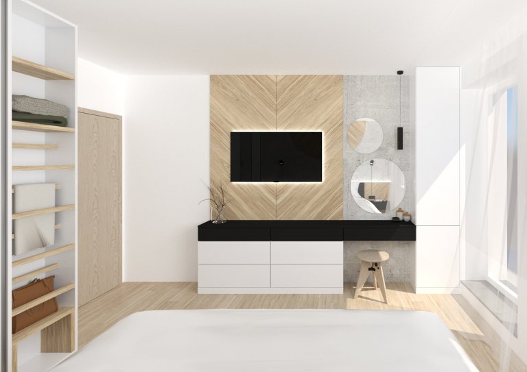 Po předchozí spolupráci na návrhu dětských pokojů pro jejich tři ratolesti nás rodiče oslovili, abychom vytvořili nové útočiště i pro ně. V ložnici si přáli zachovat poměrně novou šatní skříň a stávající oblíbenou postel. Do nevelkého prostoru jsme potřebovali zakomponovat koš na odkládání prádla, úložné komody, televizi a toaletní stolek, což nebylo zrovna jednoduché zadání. Přáním majitelů bylo do ložnice umístit také kytaru a němého sluhu. Šatní skříň jsme se proto rozhodli rozšířit o otevřený prostor na odkládání oblečení nahrazující sluhu, který také vhodně skryl komín procházející ložnicí. Součástí je i výsuvná stolička pro snazší dostupnost horních polic. Naproti posteli jsme umístili úložnou nábytkovou stěnu, jejíž součástí je i vysněný toaletní stolek. Sáhli jsme po jednoduché barevně-materiálové kombinaci, která vychází z dekoru podlahové krytiny a materiálů stávající skříně a postele.