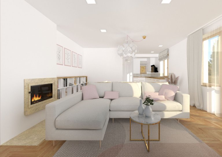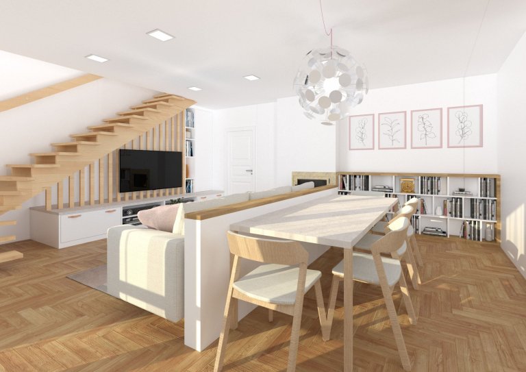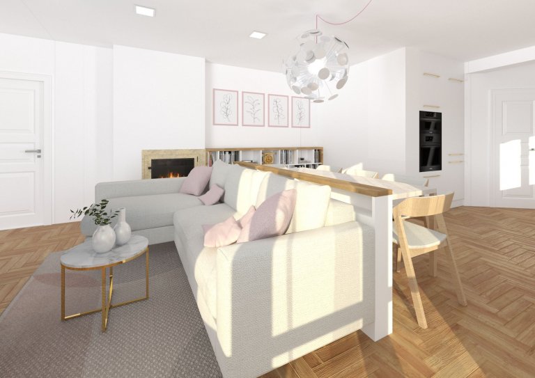 Čtyřčlenná rodina se rozhodla pro rekonstrukci svého obývacího pokoje a předsíně zejména z praktických důvodů. Předsíň nedisponovala dostatečnými úložnými prostory a bylo těžké v ní udržovat pořádek. Obývací pokoj spojený s jídelnou a kuchyní pak neumožňoval pohodlné stolování většího počtu lidí, což rodině chybělo. Nejnáročnějším úkolem celého návrhu bylo sestavit funkční dispoziční řešení, které by v netradičně tvarované místnosti dovolilo vytvořit odpočinkovou zónu i prostorný jídelní kout, přitom ale zachovalo stávající kuchyni a dostatečně pohodlné průchody pro běžný chod domácnosti. Místnost je proto rozdělena do části stolovací, kde je umístěn velký na míru vyráběný jídelní stůl s možností rozšíření v případě návštěvy, a do části relaxační s pohovkou a úložnou televizní stěnou. Celý interiér je laděn do jemných pastelových tónů.