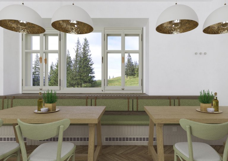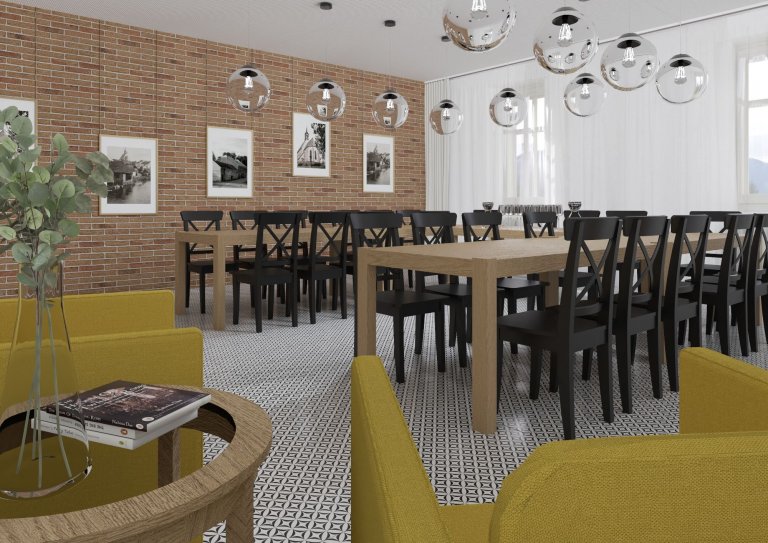 Rekonstrukce interiéru restaurace a kulturního domu v Dolním Dvořišti se nese v duchu klasické venkovské hospody. První podlaží slouží jako restaurace a její zázemí. Restaurace má dva typy zákazníků. Přes den jejích služeb využívají zejména turisté cestující přes česko-rakouské hranice, večer poskytuje příjemné posezení pro místní obyvatele. V druhém podlaží se nachází kulturní dům, který tvoří prostorná reprezentativní vstupní hala s šatnou, sál s dvěma bary a zasedací místnost. Přestože jsou prostory stavby určeny zejména pro místní komunitu, interiér se nebojí použít luxusní materiály a detaily, které pomohou vyniknout jejímu historickému charakteru. Zároveň je důraz kladen na pohodlí, praktičnost, robustní konstrukce a přírodní materiály, které prostoru dodávají zemitost a nadčasovost. Při respektování historického rázu stavby bylo vytvořeno moderní technické zázemí pro její užívání a snadnou údržbu. Interiér se má stát příjemným, praktickým a nadčasovým útočištěm jak pro návštěvníky, tak pro obsluhu.