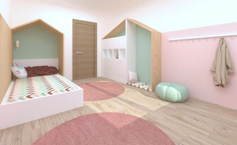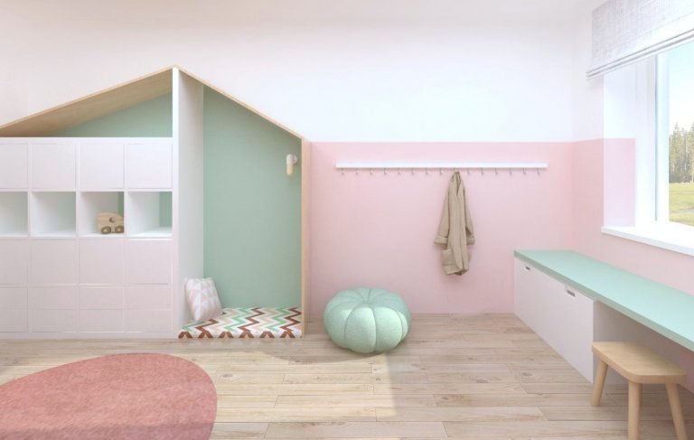 Dětský pokoj pro malou holčičku se rodiče rozhodli zařídit v oblíbené růžové barvě. Pokojíček pro předškolačku je vybaven zejména levnějším kupovaným nábytkem, aby bylo možné jej s přibývajícím věkem dcery obměňovat podle aktuálních potřeb. Pokoj byl navržen v jemných pastelových tónech, které se snadno kombinují. Místnost poskytuje útulné místo pro odpočinek, skříňky na hračky, velkorysou pracovní plochu pro tvoření a zejména dostatek volného prostoru na hraní.