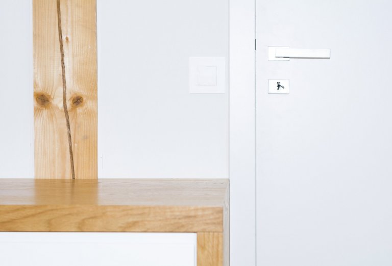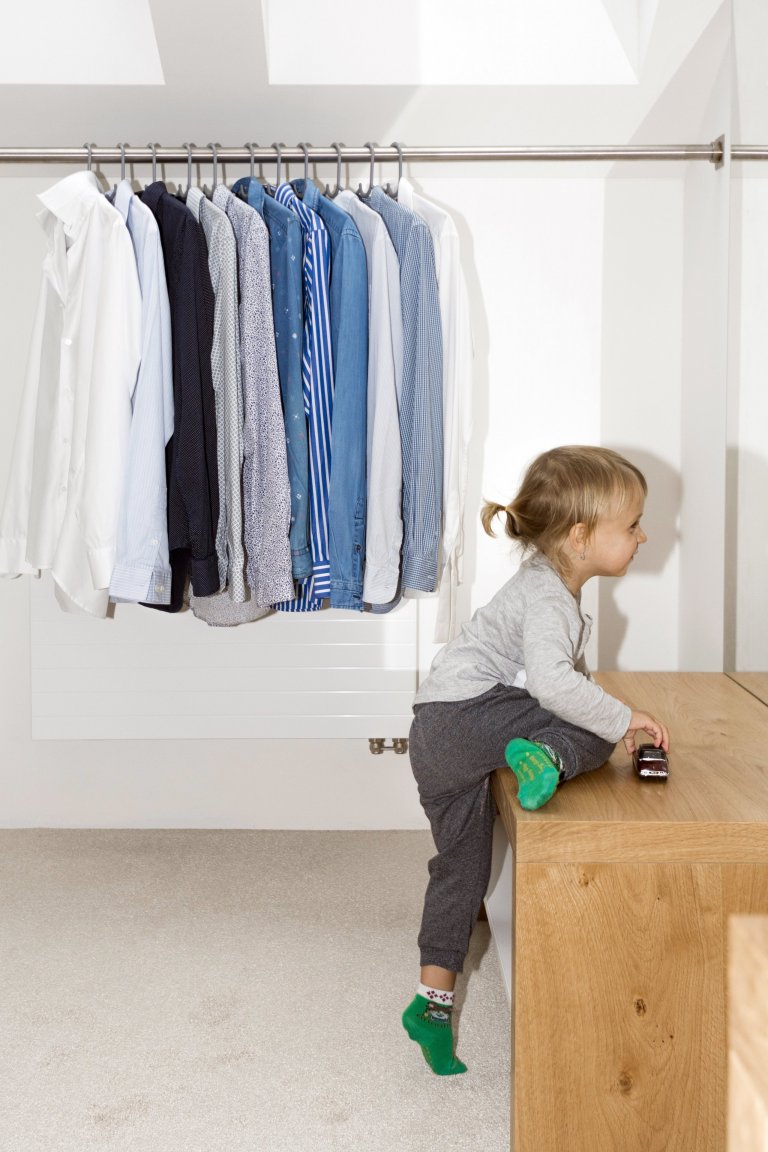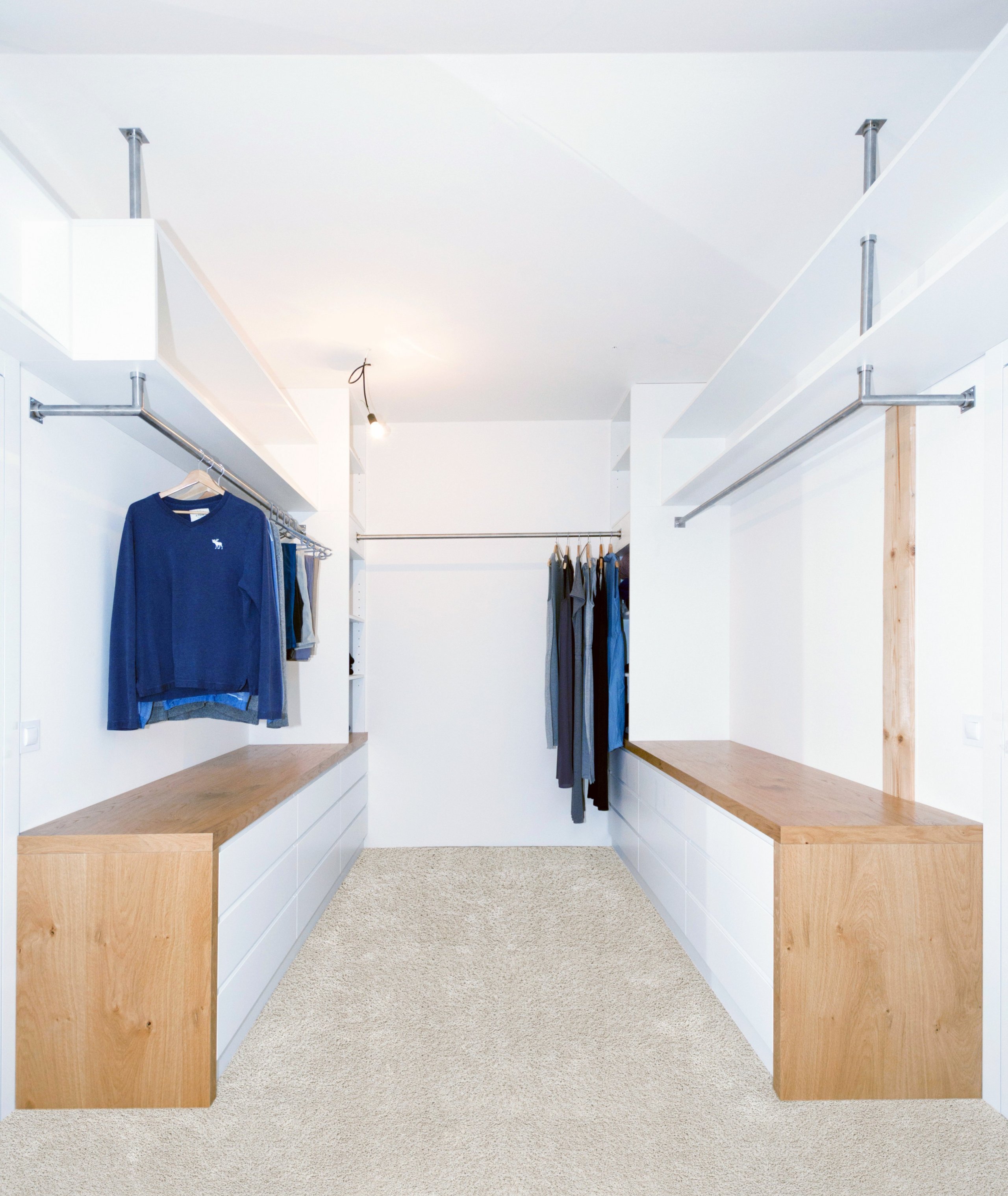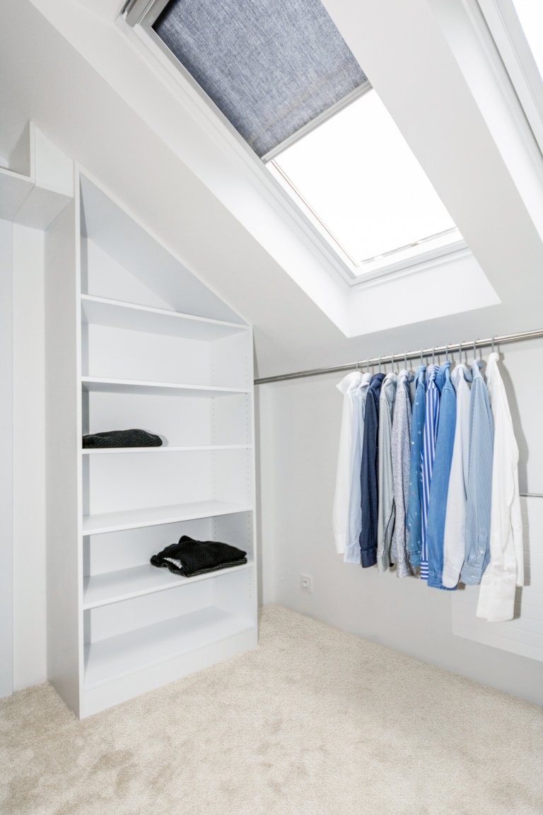 Šatna v podkrovním bytě se nachází mezi dvěma ložnicemi, které propojuje. Světlý pokoj poskytuje mnoho místa na ukládání oblečení a doplňků. Důraz při návrhu byl kladen na praktičnost a tedy i přehlednost šatny, aby všechny potřebné věci byly po ruce. Šatna je vybavena nábytkem v kombinaci bílého lamina a dubové dýhy. Použití prostorných komod, otevřených polic, dlouhých tyčí a koutku se zrcadlem a stojanem na boty vytváří příjemné a kreativní prostředí.