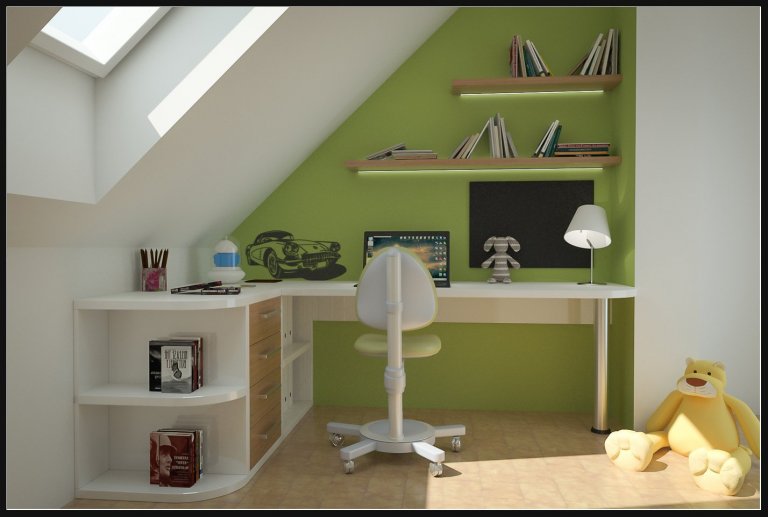 Studentký pokoj pro mladého muže se zajímavou 3D tapetou. V pokoji je řešen úložný prostor vestavěnou skříní, zavěšenou knihovnou a komodou s TV.