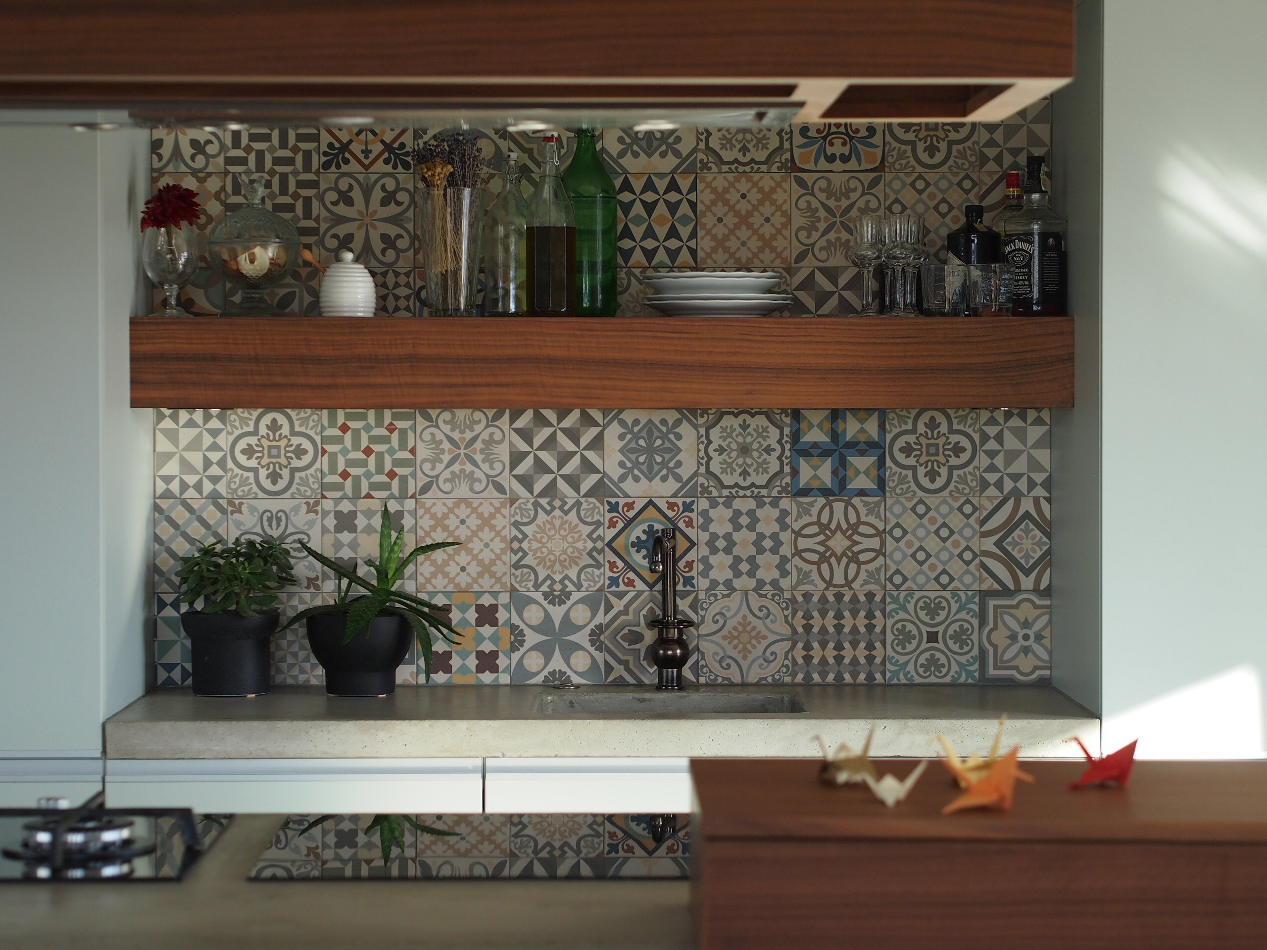 Odvaha majitele kombinovat zdánlivě nezkombinovatelné dala vzniknout moderní a zároveň osobité kuchyni. Obklad ve španělském stylu, červená barva podtrhující šarm kuchyně, bílá stěna decentně stojící v pozadí a dřevěné doplňky spolu perfektně hrají ve vzájemném souladu.