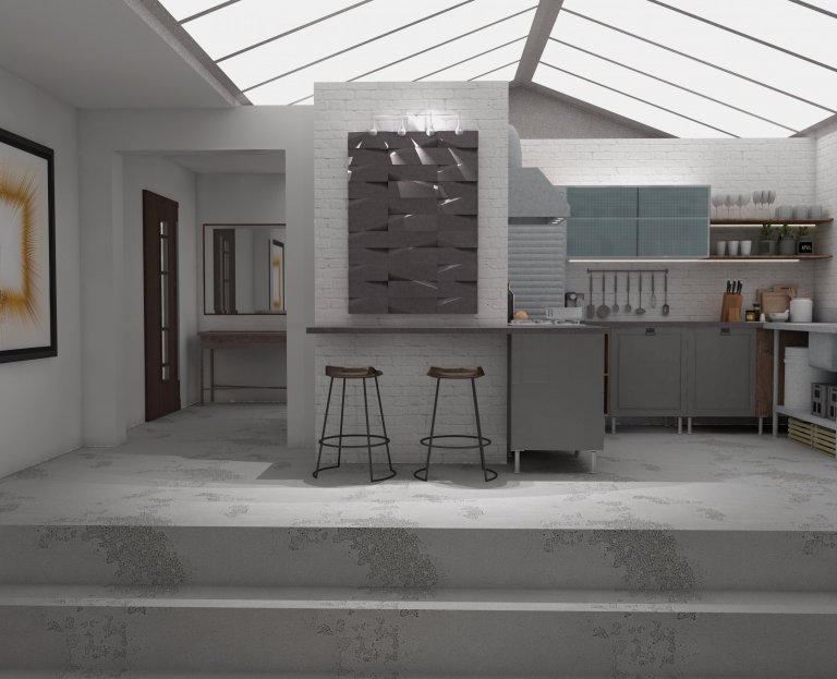 Základním požadavkem při vytváření interiéru prázdninové vily na Ibize byl respekt k tradičním postupům a architektonickým prvkům. Typické rustikální středomořské vlivy se mísí s moderními pokročilými materiály. Toto spojení je nejlépe patrné v kuchyni, kde tradiční plně integrovaná kuchyňská linka plynule přechází do moderní části opatřené pracovní deskou z technického kamene a sklěněnou zástěnou. Zajímavý detail představuje nika uzpůsobná k pohodlnému posezení s knihou a dobře vychlazeným nápojem.