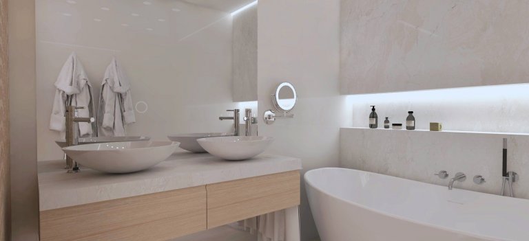 Návrh prázdninového apartmánu ve slunné Andalusii. Posuvná stěna z dřevěných lamel odděluje koupelnu s dvěma umyvadly a volně stojící vanou. Ložnice disponuje pracovním/kosmetickým stolečkem a velkokapacitní vestavnou skříní. Interiér je zařízen v jemných bílých a krémových tónech s trendy hořčičnými akcenty. Vliesová tapeta s tropickým motivem vhodně doplňuje okolní scenérii.