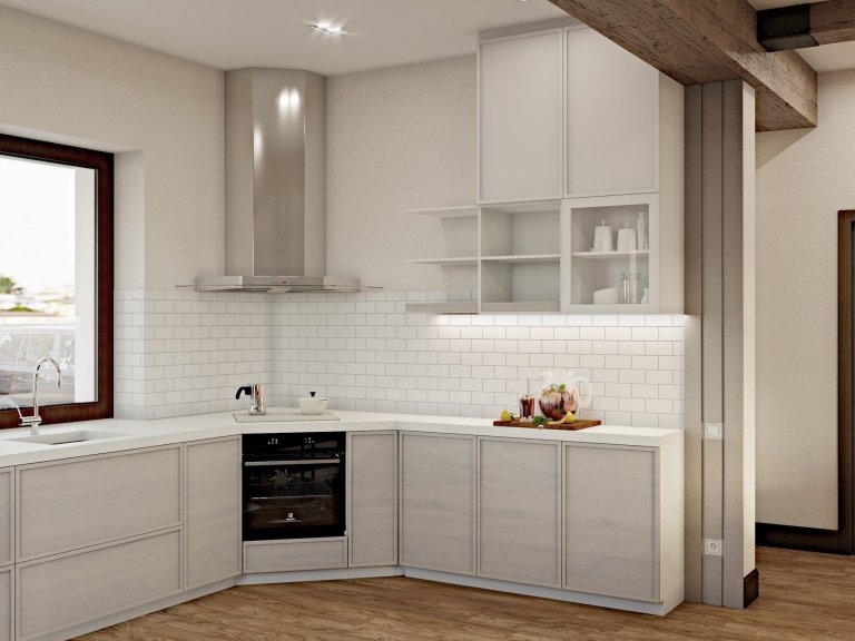 Návrh interiéru obývacího pokoje s kuchyni v rodinném domě. 3D vizualizace. Při realizaci byly zohledněny potřeby a životní styl každého člena rodiny, kteří budou v tomto domě bydlet.