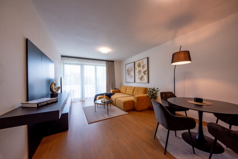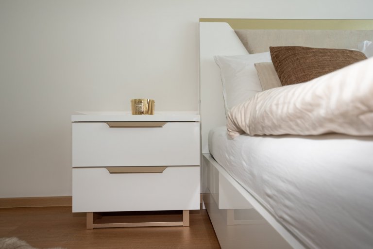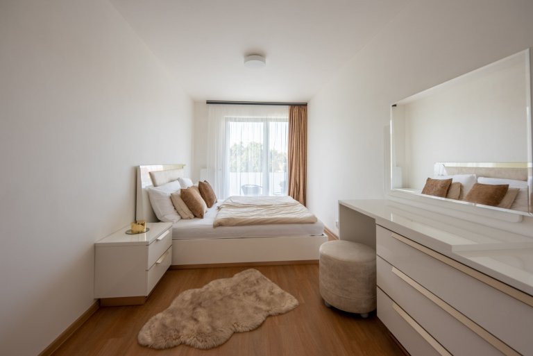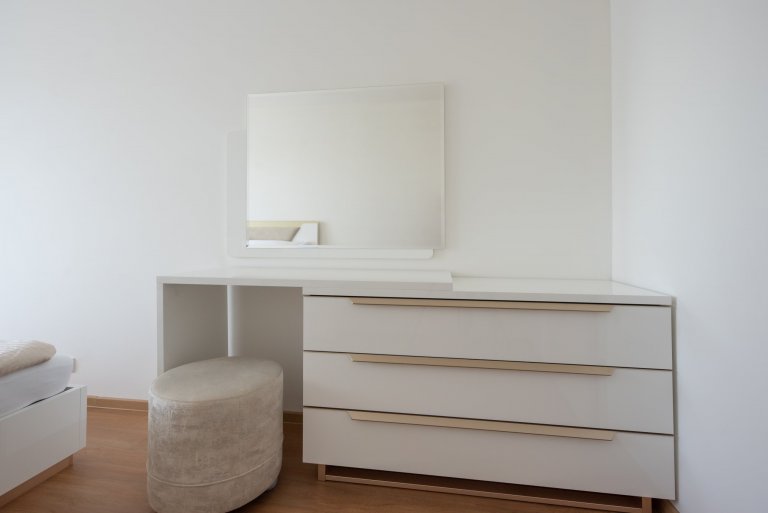 Realizace moderního obývacího pokoje a ložnice v glamour stylu.