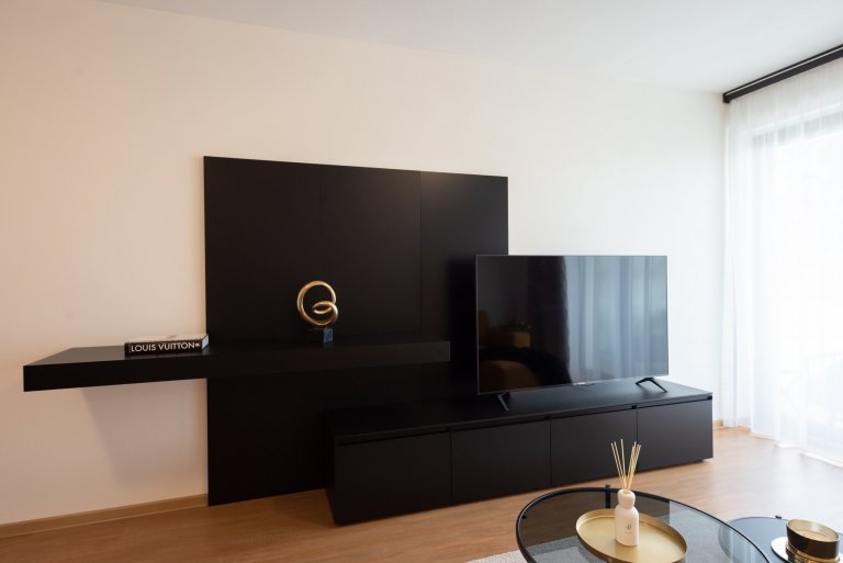 Sedací souprava je z kolekce MONO s výsuvnými sedáky, obývací stěna je v černém matném laku z kolekce Homy Giorno od výrobce Santa Lucia. Ložnice je z oblíbené kolekce Smart, která je doplněna o zlaté prvky. Textilní dekorace (závěsy a záclony) jsou též navrženy a ušity námi.