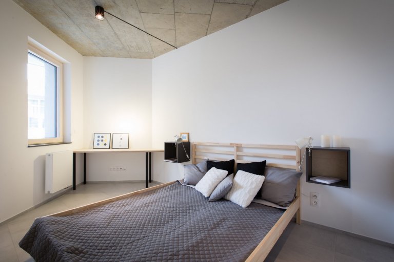Na kompletní realizaci interiéru jsem se s klientem dohodla ještě ve fázi hrubé stavby, což byla výhoda při zadávání klientských změn oproti projektu. Od klienta jsem dostala jen několik málo požadavků. 1. Byt je určený na pronájem a s tím související přiměřený rozpočet s orientací na osvědčené materiály s vysokou odolností proti opotřebení. 2. Maximální vzdušnost menšího obývacího pokoje s minimem nábytku 3. Oddělení obývacího pokoje od ložnice, ačkoli je byt stavebně koncipován v uspořádání 1kk.