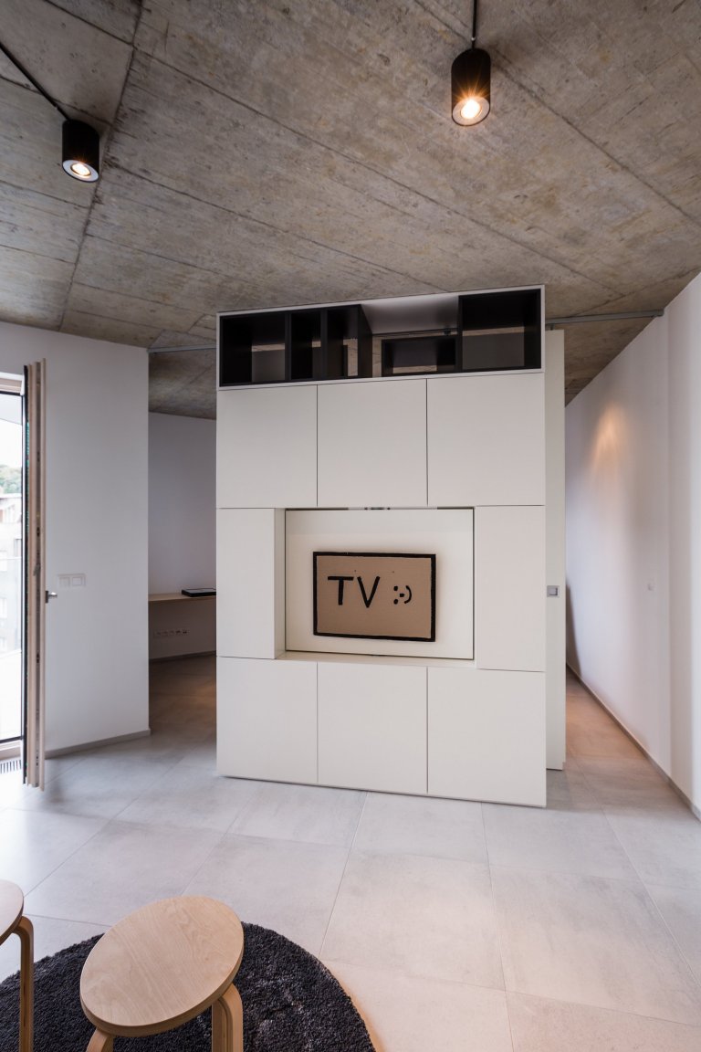 Koncept celého bytu je postaven tak, aby obyvatel vnímal jednotlivé místnosti jako jeden celek. Proto dveře ze zádveří jsou prosklené a v celé světlé výšce místnosti. S trochou nadsázky působí dojmem, že tam žádné dveře nejsou. Po vstupu do obývacího pokoje zaujme přiznaný betonový strop a vedení elektrických kabelů ke světlům. Klient si přál maximum vzdušnosti a zároveň oddělení spací zóny od obytné. Toho se podařilo dosáhnout vestavbou místo klasické příčky, která odděluje místnosti posuvnými dveřmi. Když chcete prostor, dveře otevře. Chce-li soukromí v ložnici, dveře zavřete. Vestavba poskytuje kromě velkého množství úložný prostor i místo na TV, která je připevněna na otočném karuselu, ten umožňuje sledovat TV z obývací části anebo z ložnice přímo z postele. Kuchyně je nenápadná, ale jelikož je až do stropu, poskytuje dostatek úložných prostor, stejně tak velká vestavná skříň v zádveří. Z toho důvodu může být v koupelně jen minimum nábytku a tím se podařilo splnit přání majitele, který získal nejen vzdušný obývací pokoj, ale doslova celý byt.
