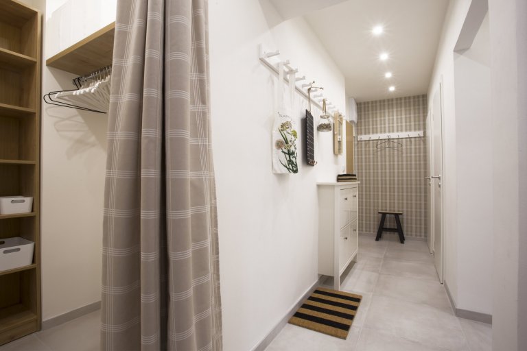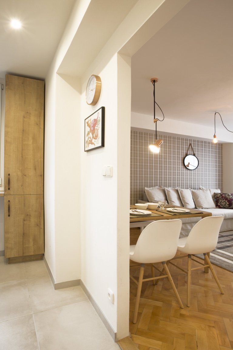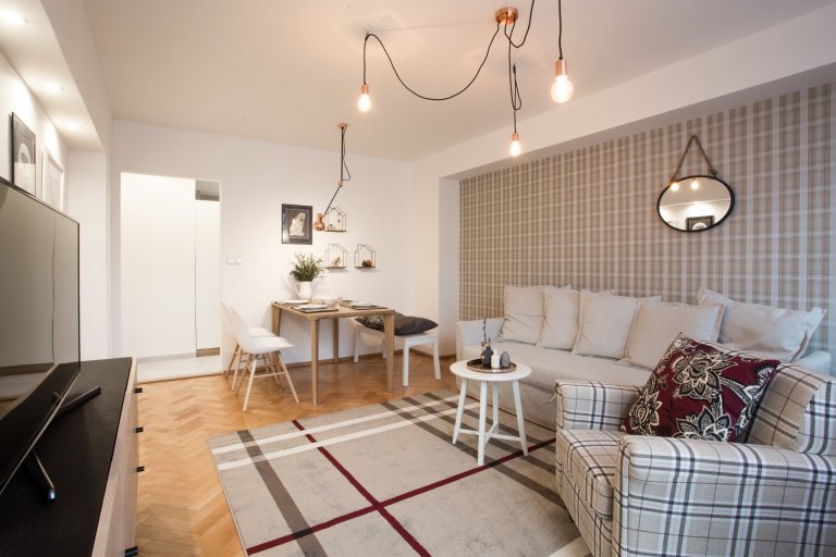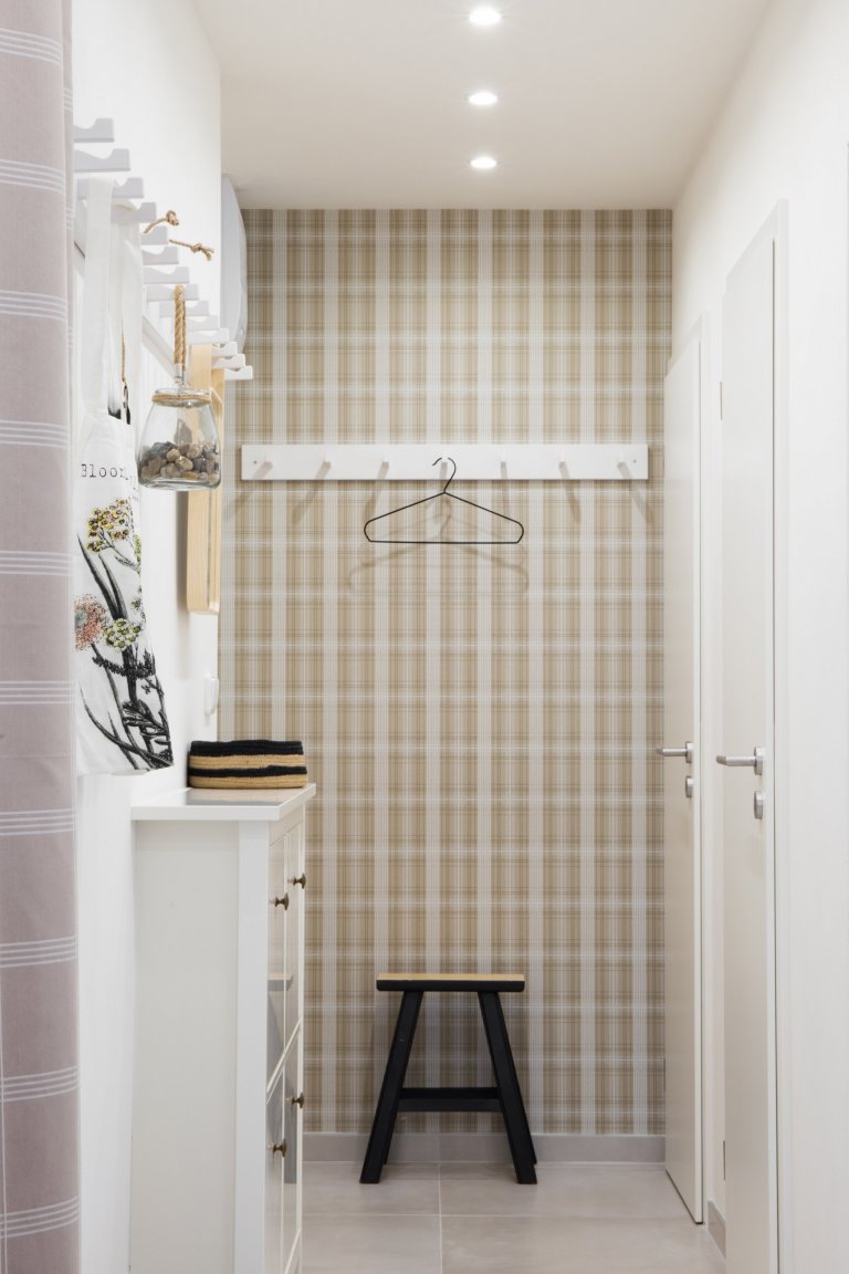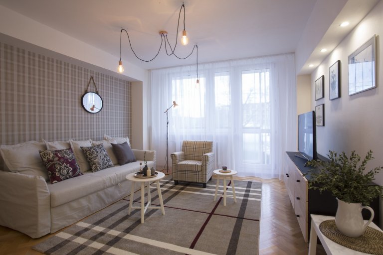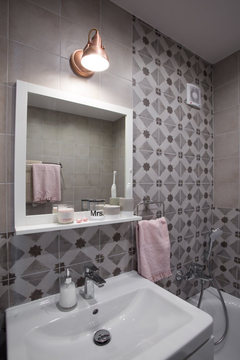 Celý byt je navržen v duchu moderního bydlení s domáckou atmosférou. Obytné místnosti a chodba byly dekorovány tapetou se vzorem kostky, vzor se opakuje také například na koberci v obývacím pokoji nebo na závěsu, který zakrývá vstup do malé šatny. Aby poměrně konzervativní základ bytu nenudil, zvolili jsme osvětlení a dekorace v měděném akcentu, který se dobře hodí jak k hnědým tónům (obývací pokoj, koupelna), tak k šedým (ložnice) - útulnému bydlení dodává jednoduše "šmrnc".
