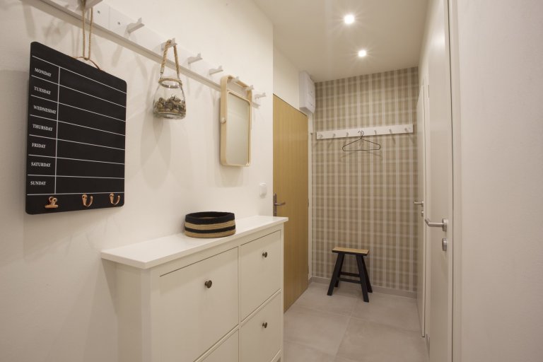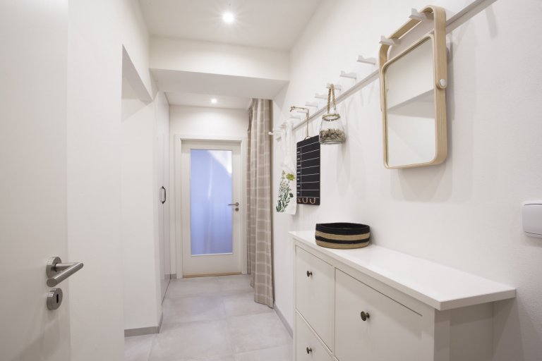 Byt o rozloze 55 m2 obývá žena středního věku. Dispoziční řešení bytu pro jednu osobu bylo vyhovující a proto se bourací práce odehrály pouze v koupelně, kde bylo vybouráno původní jádro. Velké změny proběhly především ve výměnách podlahových krytin a obkladů, v obývacím pokoji a v ložnici jsme repasovali bukové parkety. Bytu hodně prospělo nové osvětlení - bodovky v sádrokartonových podhledech celou chodbu, sociální zázemí a kuchyň přímo rozzářily. Osvětlení hraje velkou roli také v obývacím pokoji, kde je umístěno bodové osvětlení nad galerií obrázků, které majitelka sama nakreslila.