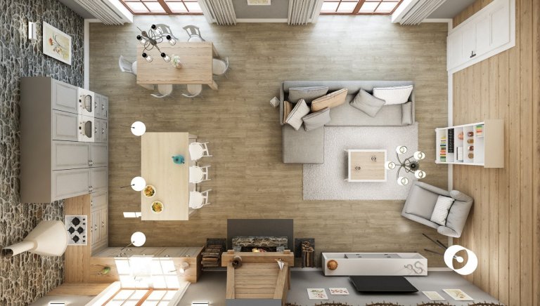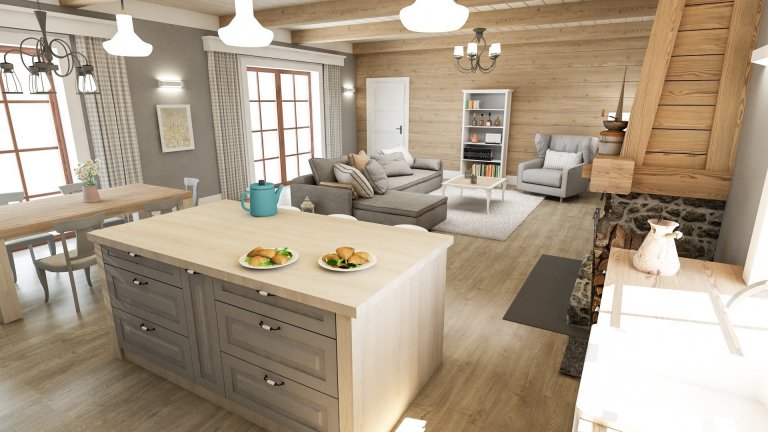 Jedná se o studii hlavního prostoru ve srubovém domě. Stylově se jedná o velice tradiční řešení s trámovým stropem, otevřeným krbem a dřevem i kamenem na stěnách. Díky kombinaci použitých dekorů a snaze použít světlé přírodní odstíny dřeva, podlahy i nábytku vzniká příjemný prostor, který těží z krásy poctivých materiálů.
