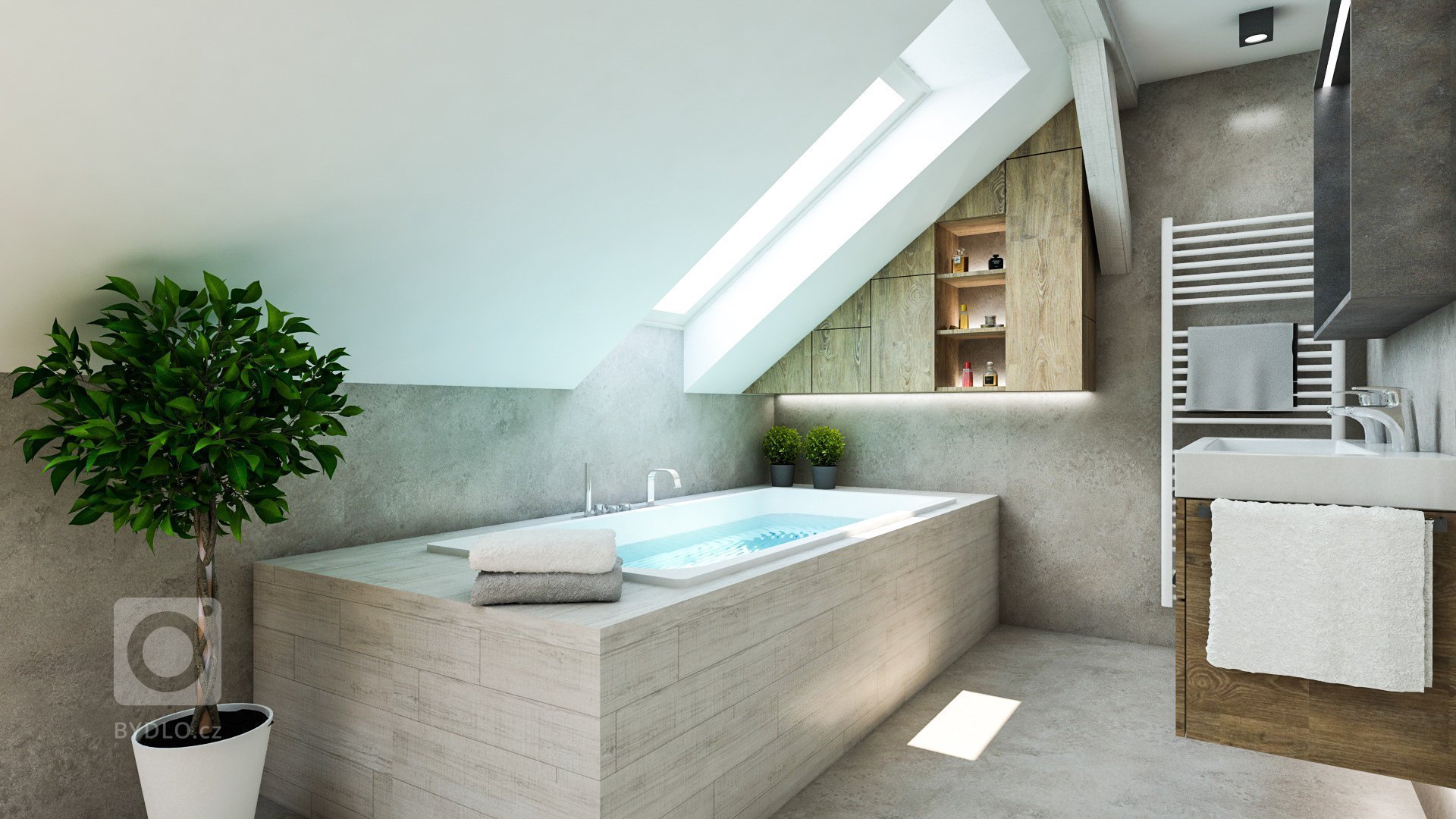 Návrh koupelny je součástí rekonstrukce podkrovního bytu v centru Bratislavy. V místnosti se mají prolínat tmavší prvky z obývacího pokoje a kuchyně spolu se světlejším řešením dětských pokojů.