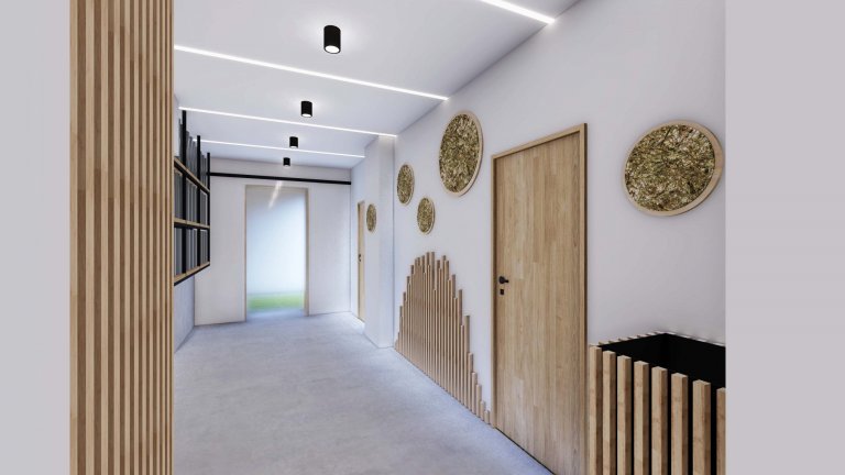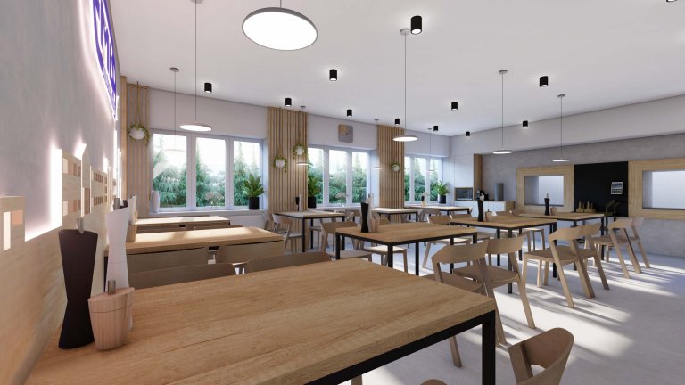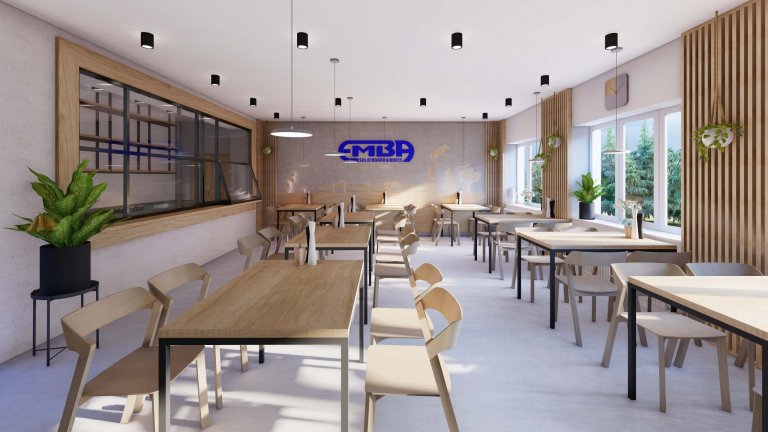 Jídelna společnosti Emba v Pasekách nad Jizerou je navrhnuta v univerzálním designu pro prostor, který má vyhovovat vedení i zaměstnancům. Pro interiér jsou použity betonové stěrky, dekor dubového dřeva na dýhových a masivních materiálech. Nad stoly visí osvětlení od Severského světla a židle doplňující vyrobené stoly na míru jsou od české firmy TON. Čelní stranu zdobí grafika z překližky, která vystihuje corporate identity a vizi firmy.