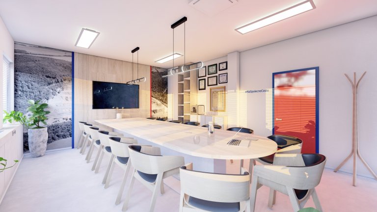 Vytvořil jsem koncept částečně inspirovaný corporate identity společnosti, v propojení s odkazem na hlavní náplň liberecké divize – kamenolomy. Hlavním použitým materiálem v interiéru jsou dekory kamene, dubového dřeva a bílé. Dokonalé spojení harmonických přírodních tónů je doplněno kontrastním protipólem ve formě červené a modré barvy, které jsou přejaté právě z grafické identity společnosti. Barvy využívám jen jako doplňkové na zajímavých místech. Dominantou prostoru je fototapeta jednoho z kamenolomů patřícím Eurovii. V interiéru je několik originálů od české společnosti TON (například křesla Merano, věšáky Logs a Fleur). Další dominantou je na míru tvořený jednací stůl, který je přes pět metrů dlouhý. Nad ním visí dokonale elegantní osvětlení od značky Nova Luce s názvem Arte Elipse.