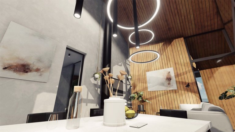 Moderní interiér, v horském stylu s výhledem do přírody Jizerských hor, kde hraje hlavní roli betonová stěrka s medovými odstíny dřeva, které doplňují přírodní tóny. Kontrastní barvou je zvolena antracitová, která se objevuje hlavně na doplňcích, osvětlení a krbu. Tím je docíleno technického industriálního rázu, kterým je prostor oživen. Horský apartmán je v loftovém provedení s velmi vysokými stropy a to nám dovolilo zavěsit kaskádovitě několik designových světelných obručí, které vysoký prostor oživí a ozvláštní. Kuchyň je vestavěná do vytvořených výklenků, takže prostor působí čistě bez jakýchkoli vystrčených částí nábytku. Design navazuje na betonovou stěrku, jen jsme zvoleno lamino o odstín tmavší, než je v dekoru stěny. Velkou dominantu jsou velká celoplošná okna, díky kterým je prostor dostatečně prosvětlený. Navíc je zde velká terasa, která dokonale propojí interiér s okolním výhledem na Bedřichovskou sjezdovku.