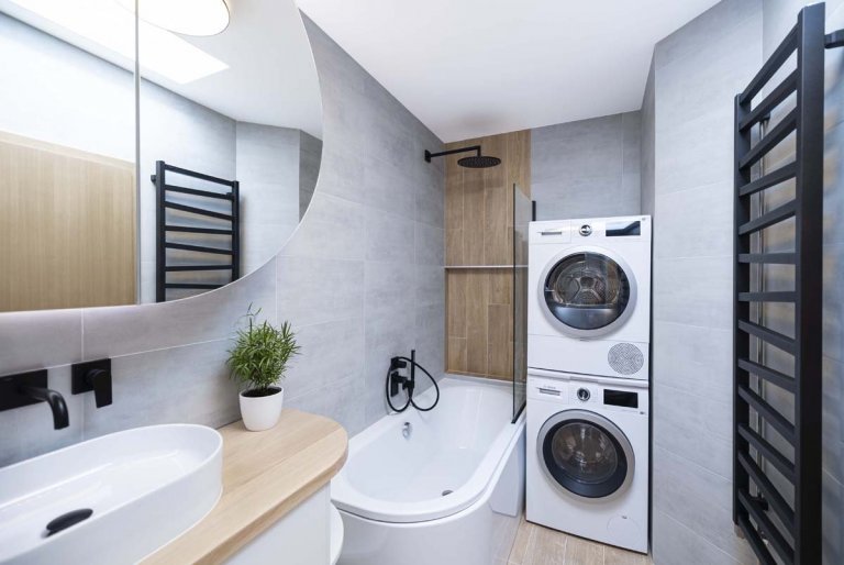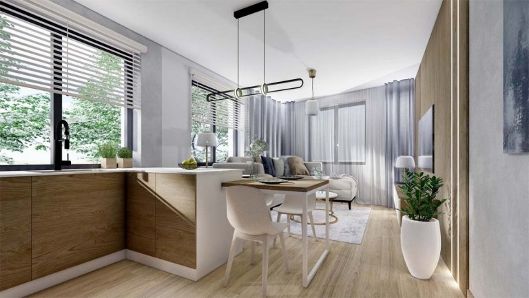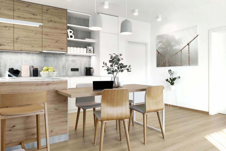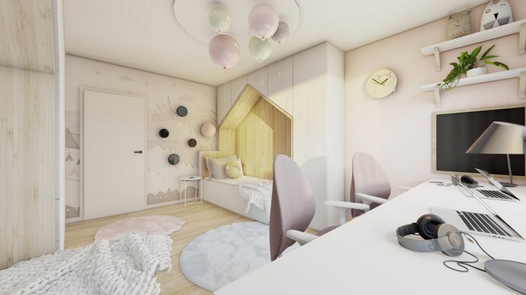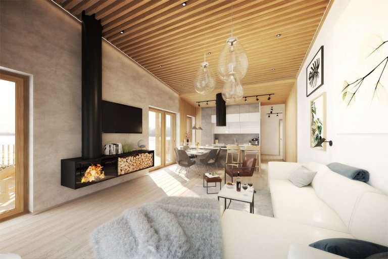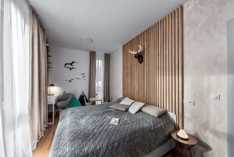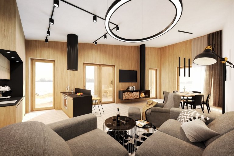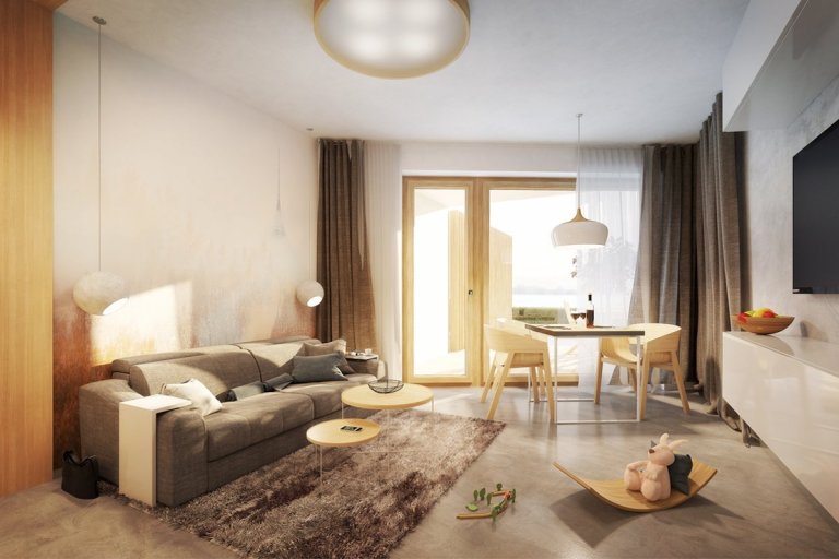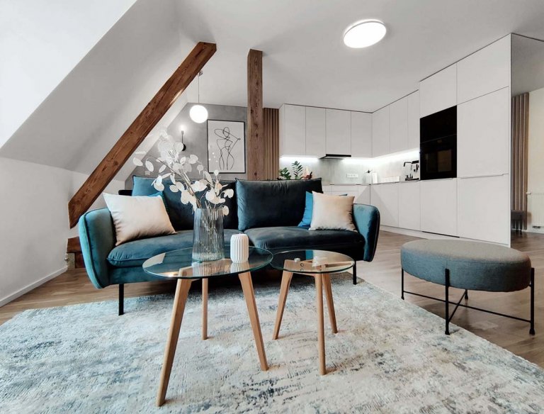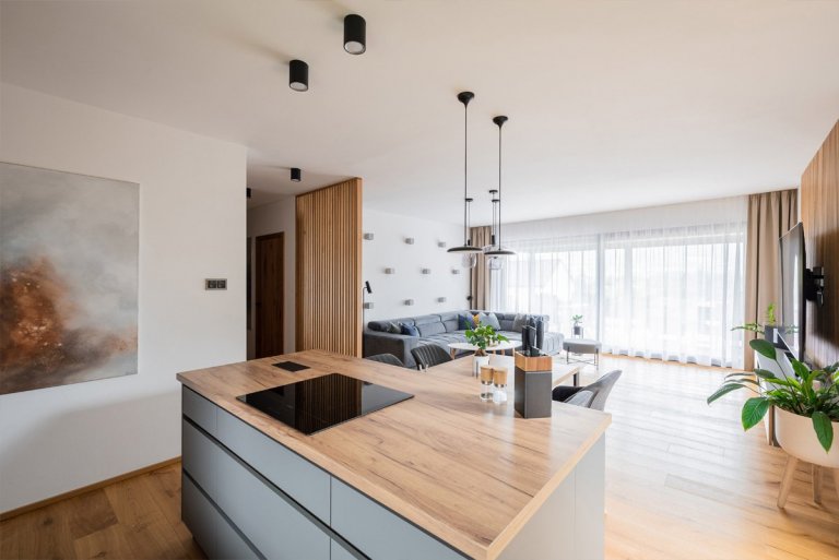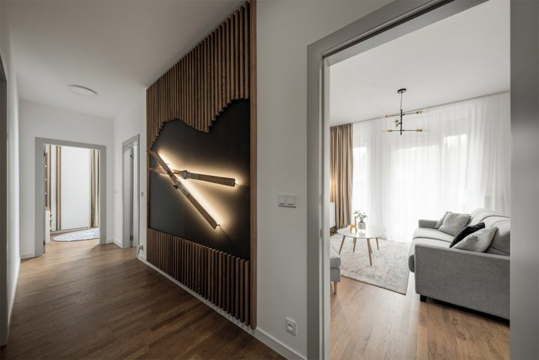 Dolcevita Harrachov je developerský projekt, který vznikl v srdci Krkonoš. Náš apartmán je jedním z mnoha, který tento komplex poskytuje. Některé k pronájmu pro turisty, jiné pro celoroční bydlení. Apartmán je laděný do světlých tónů s odkazem právě na Krkonoše. Bílý základ doplněný celodřevěnou podlahou v dekoru dubu. Nábytek jsme také ladili do bílých tónů matového lamina Perfect sence a dekoru dubu. V kuchyni je kvůli vyšší odolnosti použitý bílý matný lak a dýhované skříňky. Pracovní a vrchní desky u nábytku jsou z kompaktní desky slim line. Hlavním výrazným prvkem celého apartmánu je laťové obložení, kteté prostor krásně doplňuje a propojuje s přírodou. V chodbě je prvek dokonce propojený s funkcí obrazu, ve kterém jsou umístěny staré zrenovované dobové lyže ze dřeva, které jsou podsvícené zapuštěnými led pásky přímo do lyží. Osvětlení je v projektu z velké části od liberecké firmy Severské světlo. Vestavěný nábytek od truhlářů ze Silveko.