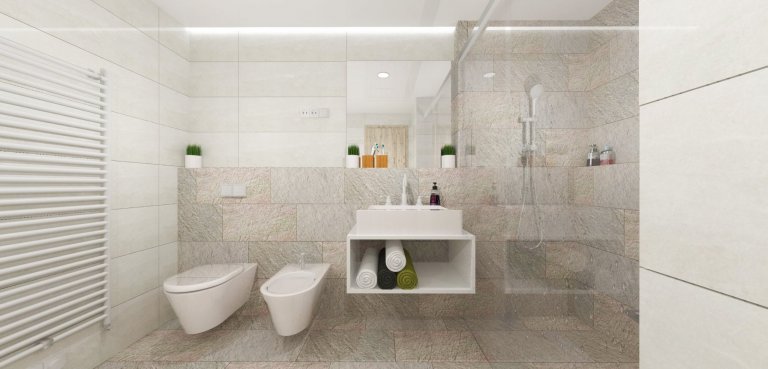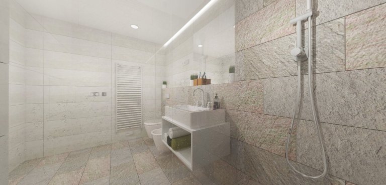 Minimum nábytku a úložných prostor je pro koupelnu velké plus, jelikož jsou v bytě úložné prostory řešeny praktickou technickou místností. Sprchový kout je bezvaničkový se samospádem, což pro uživatele vytváří částečný bezbariérový přístup. Uvnitř je sedátko pro komfortnější sprchování v pokročilém věku.