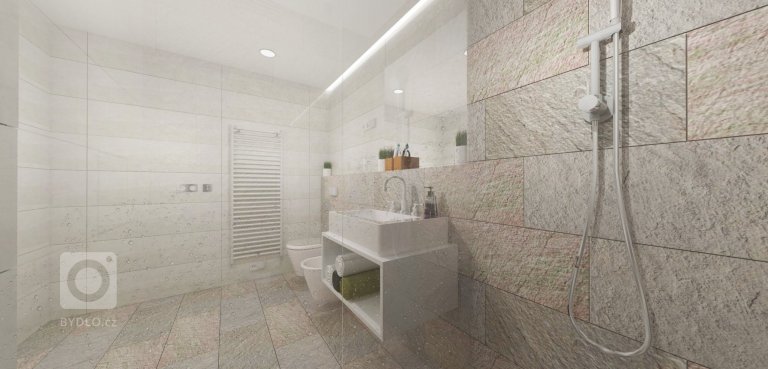 „Koupelna uzpůsobená pro vícegenerační život.“ Chladné přírodní tóny kamene doplněné o světlý mramor s olivovým akcentem, který je podpořen detaily ze světlého dřeva a bílého nábytku. „Interiér je navržen ve spolupráci s architektonickou kanceláří Siadesign Liberec, která je…