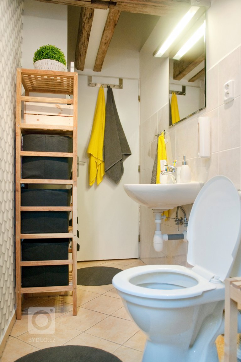 „Půdní garsonka jako startovací hnízdo.“ Světlá Skandinávie v přírodních tónech, masivní dřevo v kontrastu s čistou bílou doplněné černobílými vzory a energickou žloutkovou. „Prosvětlení prostoru, bylo hlavní prioritou. Jemné tóny a kontrastní bílá barva vyvažuje tmavší…