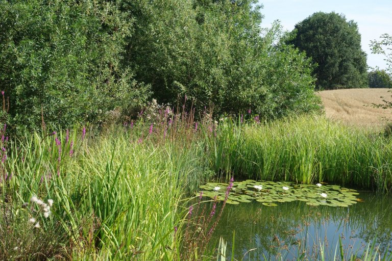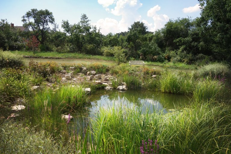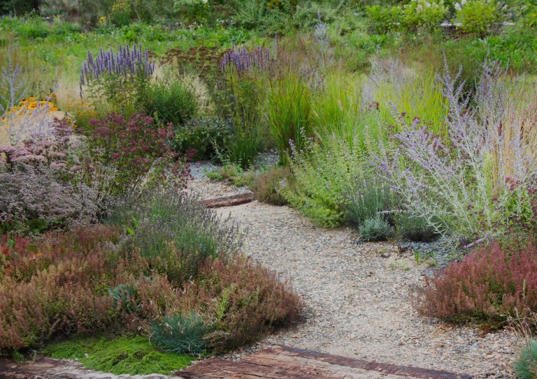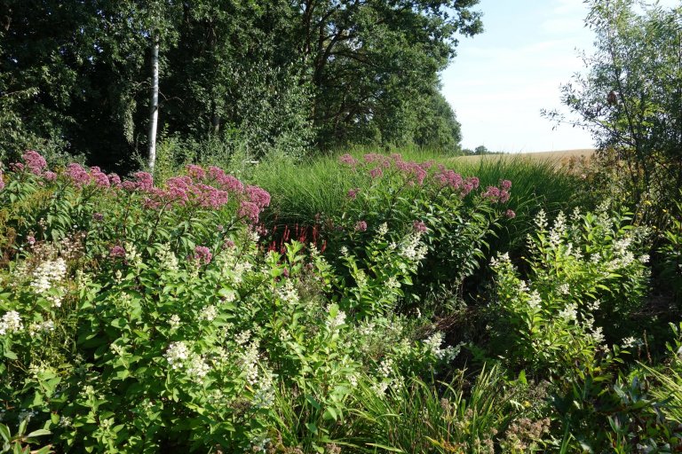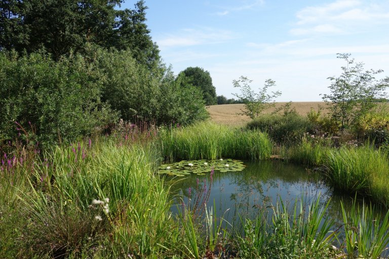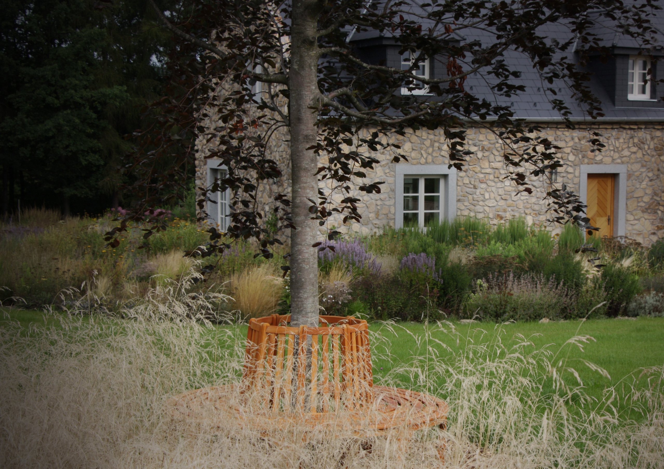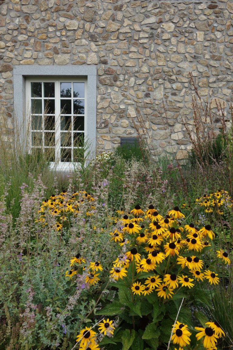Zahrada byla navržena a zrealizována u novostavby krásného kamenného domu inspirovaného Bretaní. Svažité a lemující oblasti jsou pokryty lučním porostem. Dominantou v prostoru je trvalkový záhon, kontrastující s kamenným pozadím domu. Tvořen je z velké části jedlými a aromatickými rostlinami. Vytváří převážně fialovo-žlutý barevný efekt květů od jara do podzimu. Pozemek není oplocen a zahrada tak volně přechází do krajiny.Otevřít v editoru