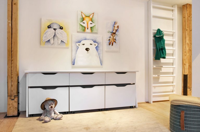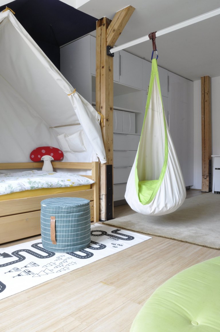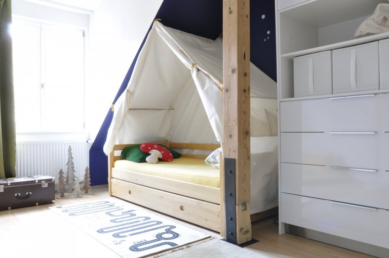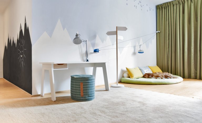 Tenhle předškolák miluje cestování. S rodiči a starší sestrou si v zimě užívá lyžování a dlouhé jízdy lanovkou. V létě chodí v po horách, spí ve stanu, rád pozoruje hvězdy na nebi. Nebojí se, protože má s sebou psa. Ukazatel ve tvaru rozcestníku se značkami přirozeně rozděluje pokoj do zón – odpočinkovou, hrací a tvořivou. Nad matrací na podlaze visí jezdící lanovka. Stan slouží nejenom ke spaní, ale i jako dokonalá schovka. Na koberci je dostatek místa pro stavitelské pokusy a hraní. Velké boxy na kolečkách jsou velmi praktické, prostorné a také usnadňují úklid.