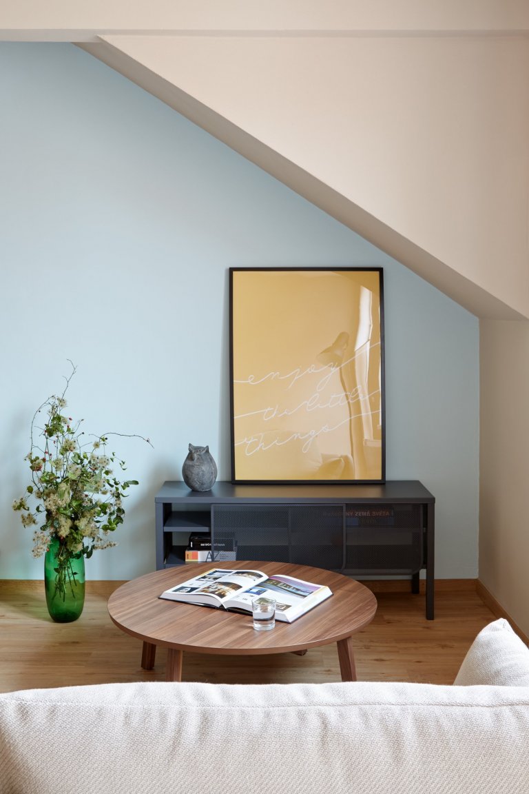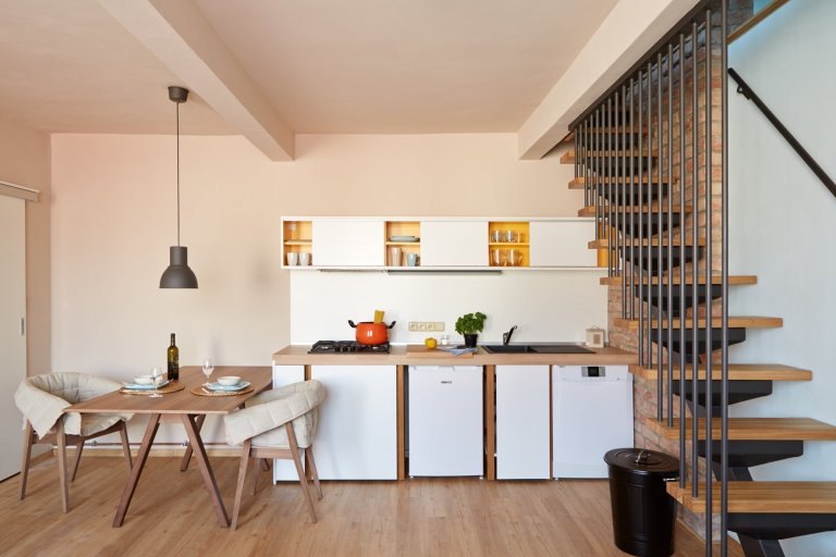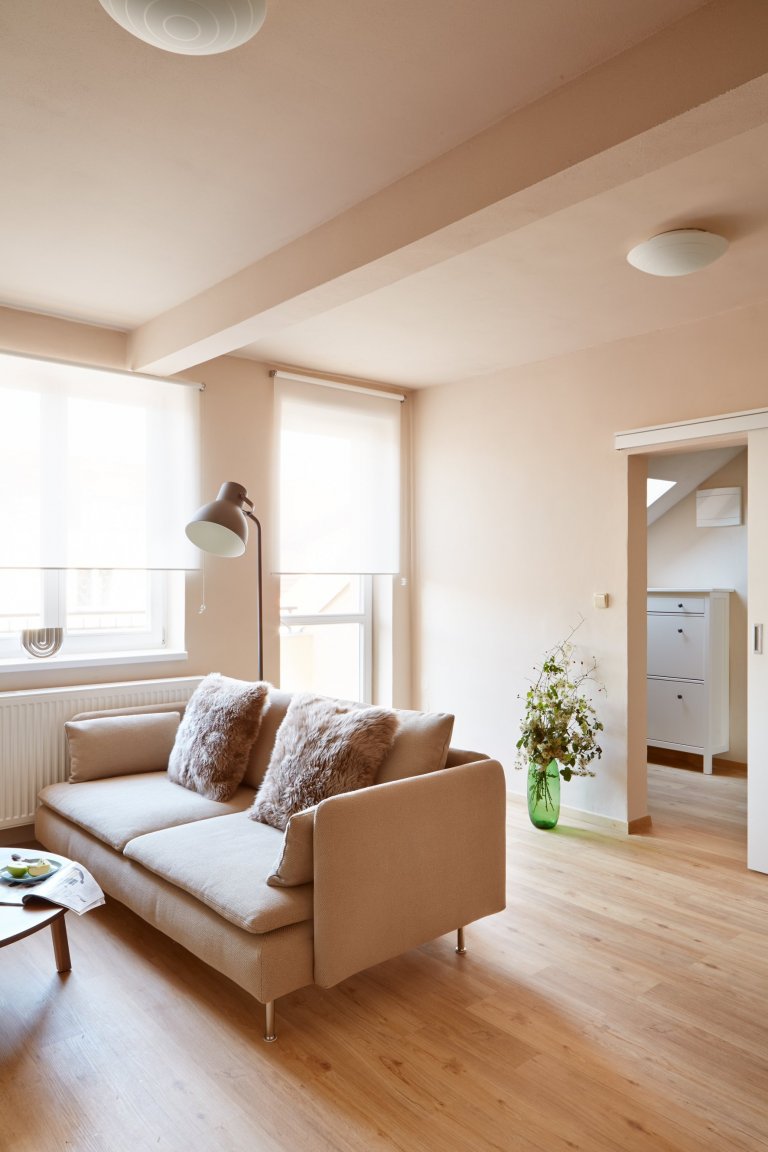 První byt nebývá velký, ani navždy. Fantazii mírně krotí nedostatek financí, ale i s malým rozpočtem můžete bydlet krásně. O návrhu bytu jsem uvažovala během dovolené u moře, což se pozitivně promítlo do interiéru. Kombinace barev připomíná moře, pláž, písek a slunce. Vsadila jsem na tradiční přírodní materiály – dřevo a kov. Kuchyň, schody a posuvné dveře byly vyrobeny na míru a ostatní nábytek jsem vybírala v IKEI. Váš byt je vaše oáza, vaše útočiště, váš domov. A jak jej zařídíte, jakou energii a emoci do něj vložíte, takovou budete dostávat zpět. Prostor potřeboval prosvětlit. Denní světlo dodá místnostem atmosféru, zútulní ji a opticky zvětší. Okna jsem proto zvětšila a navíc díky stavebnímu povolení bylo možné přistavět i balkon, který tu původně nebyl.