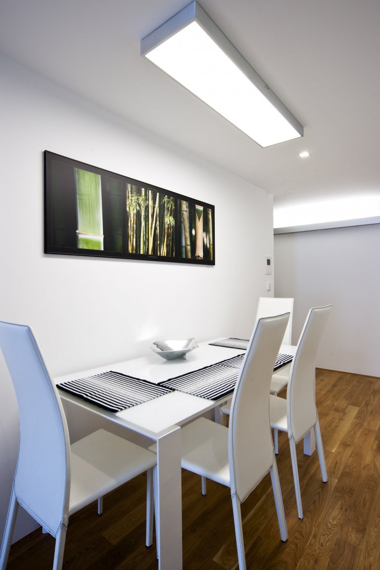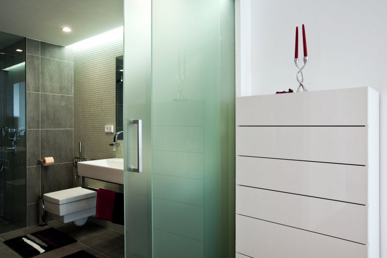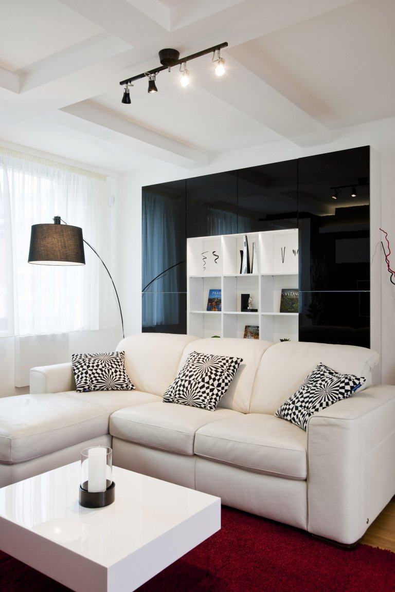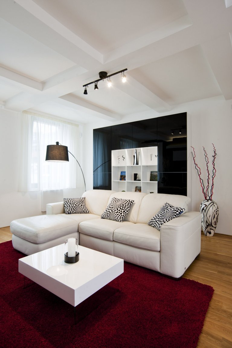 V nově rekonstruovaném bytovém domě v Praze - Karlíně vzniklo 21 luxusních bytů s otevřenou dispozicí vnitřně dělenou nábytkovými příčkami. Centrální příčka oddělující obývací část od ložnice a koupelny obsahuje integrované posuvné dveře umožňující v případě potřeby vytvoření klidového prostředí. Praktická je také vestavná šatní skříň, která vytváří koridor chodby a odděluje ji od kuchyňské části. Zajímavým prvkem je „levitující“ konferenční stolek v obývací části navržený na zakázku Robertem Matulou.